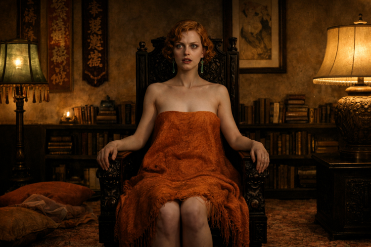 部屋の|一端の|低い|台の|上に|高い|背もたれの|チーク材の|椅子が|あり、|そこに|カーメン・スターンウッドが|フリンジの|ついた|オレンジ色の|ショールの|上に|座っていた。||彼女は|非常に|まっすぐに|座り、|両手を|椅子の|肘掛けに|置き、|膝を|閉じ、|エジプトの|女神のような|ポーズで|体を|硬直させ、|顎を|水平に|保ち、|わずかに|開いた|唇の|間から|小さく|白い|歯が|光っていた。||目は|大きく|見開かれていた。||虹彩の|濃い|スレートグレーが|瞳孔を|飲み込んでいた。||狂った|目だった。||意識が|ないようにも|見えたが、|無意識の|人間の|ポーズでは|なかった。||頭の|中で|何か|とても|重要な|ことを|して|うまく|やり遂げているかのように|見えた。||口から|は|ブリキのような|くすくす笑いが|漏れていたが、|表情を|変えることも|唇を|動かすことも|なかった。