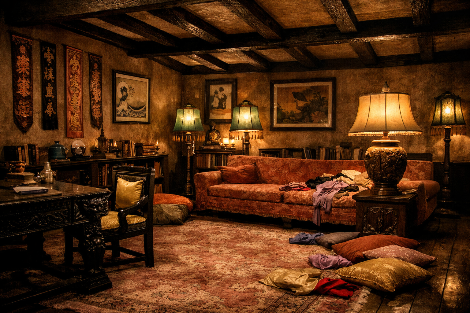 部屋は|広く、|家の|幅全体を|占めていた。||低い|梁の|天井と|茶色の|漆喰の|壁には|中国の|刺繍の|帯と、|木目の|額縁に|入った|中国と|日本の|版画が|飾られていた。||低い|本棚が|あり、|ピンクがかった|厚い|中国の|絨毯が|敷かれていた。||毛足が|深くて|モグラが|一週間|隠れていても|鼻先も|出ないほどだった。||床には|クッションが|置かれ、|珍しい|絹の|切れ端が|あちこちに|投げてあった。||住んでいる|人間が|手を|伸ばせば|いつでも|触れる|場所に|絹が|なければ|ならないかのように。||古い|ローズ色の|タペストリーの|幅広く|低い|長椅子が|あった。||その|上には|衣類が|山と|なっていて、|ライラック色の|絹の|下着も|あった。||台座に|載った|大きな|彫刻入りの|ランプと、|翡翠色の|傘に|長い|房飾りが|ついた|スタンドランプが|二つあった。||四隅に|ガーゴイルの|彫刻が|施された|黒い|机が|あり、|その|後ろには|彫刻入りの|肘掛けと|背もたれの|磨かれた|黒い|椅子に|黄色い|サテンの|クッションが|置かれていた。||部屋には|様々な|臭いが|混じっていたが、|その|中で|最も|強烈なのは|火薬の|刺激臭と|エーテルの|むかつくような|香り1だった。