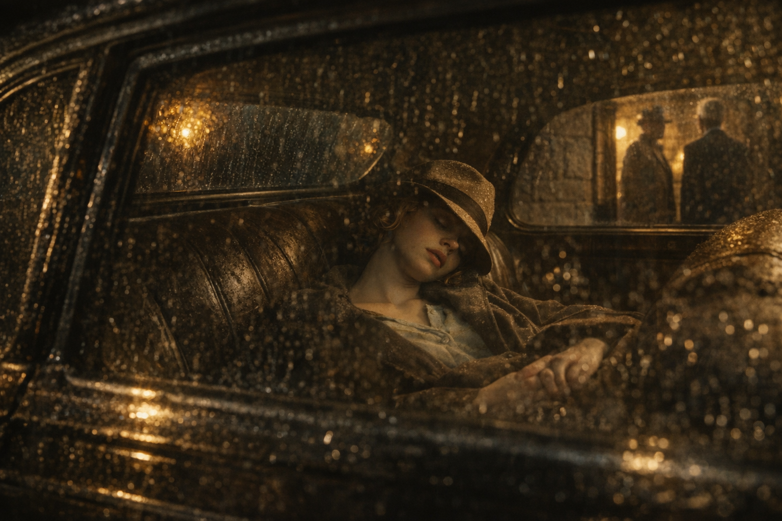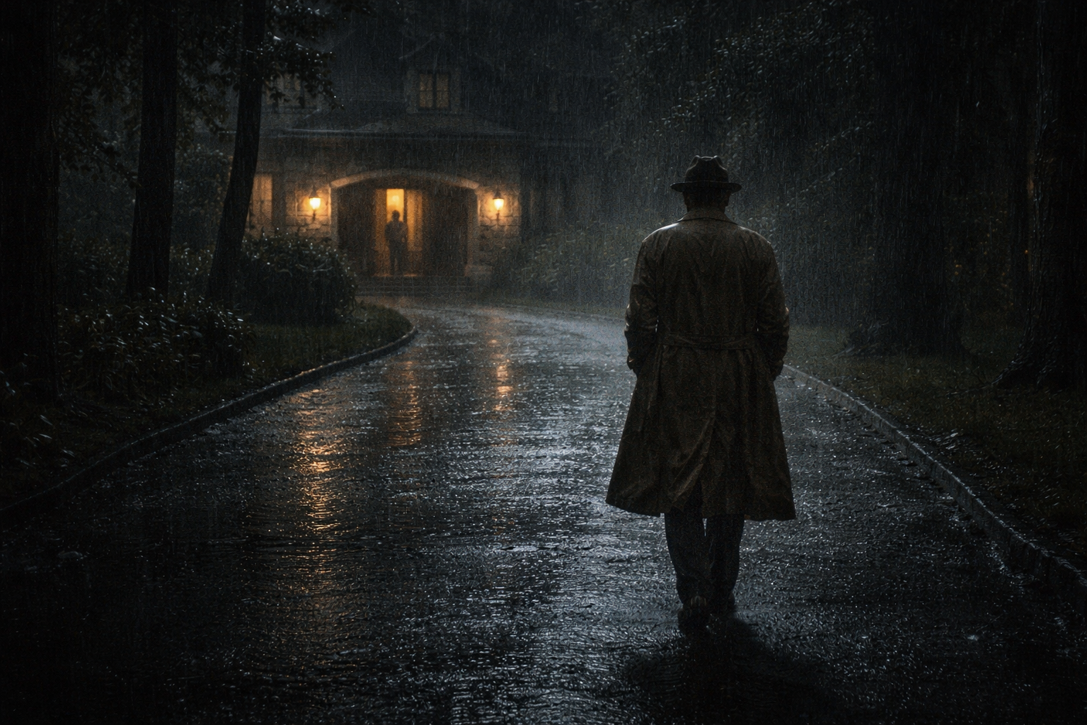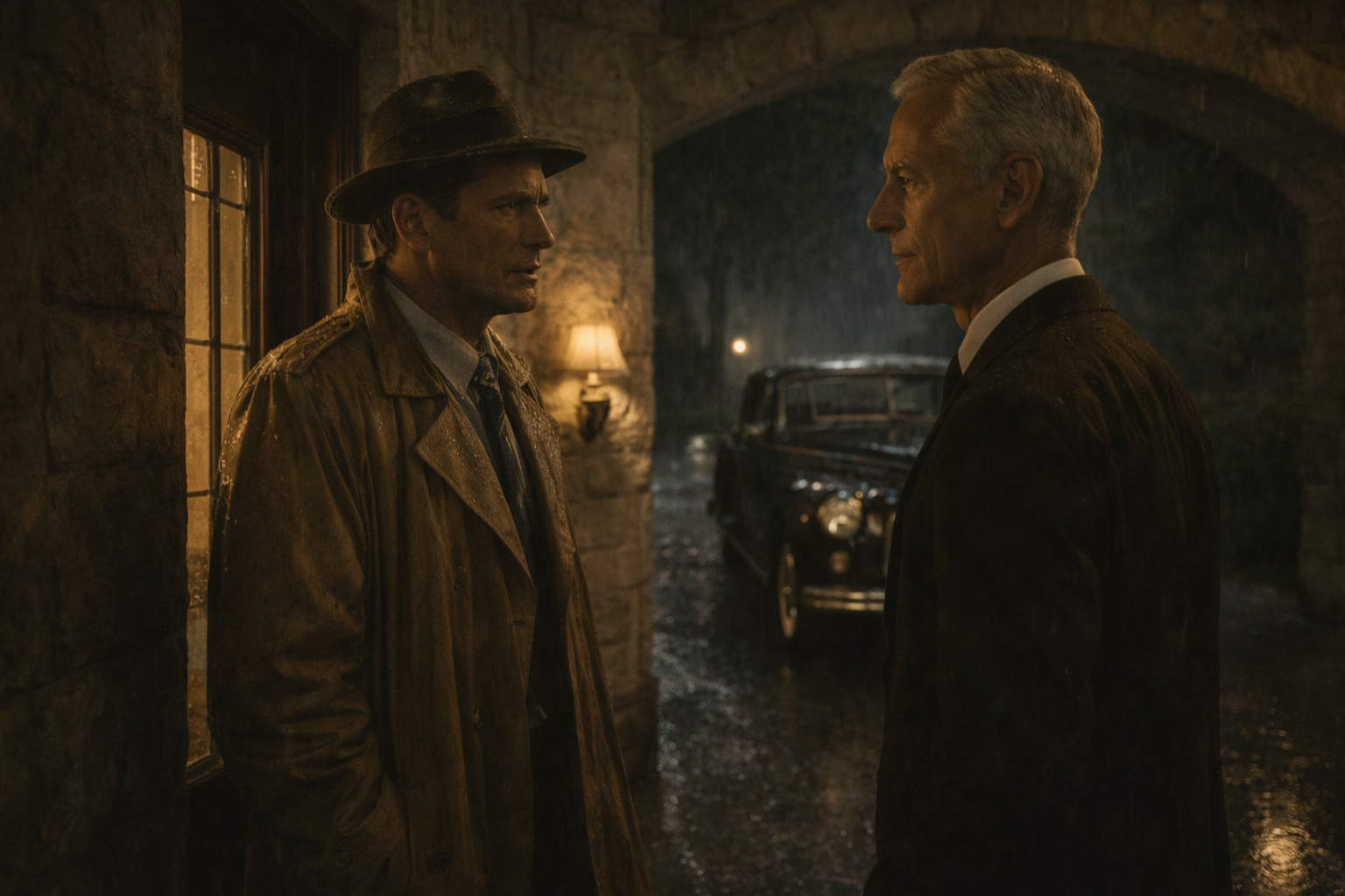 スターンウッド邸の|脇扉の|細い|格子窓の|向こうに、|かすかな|明かりが|あった。||ポルト・コシェール1の|下に|パッカードを|止め、|座席に|ポケットの|中身を|空けた。||娘は|片隅で|いびきを|かいていた。||帽子が|鼻の上に|傾いで、|手は|レインコートの|ひだの中に|だらりと|垂れていた。||車を|降りて|ベルを|押した。||足音が|ゆっくり|近づいてきた。||遠い|うんざりするほど|遠い|場所から|やってくるような。||扉が|開いて、|背筋の|伸びた、|白銀の|執事が|顔を|出した。||廊下の|明かりが|彼の|髪に|後光を|作っていた。