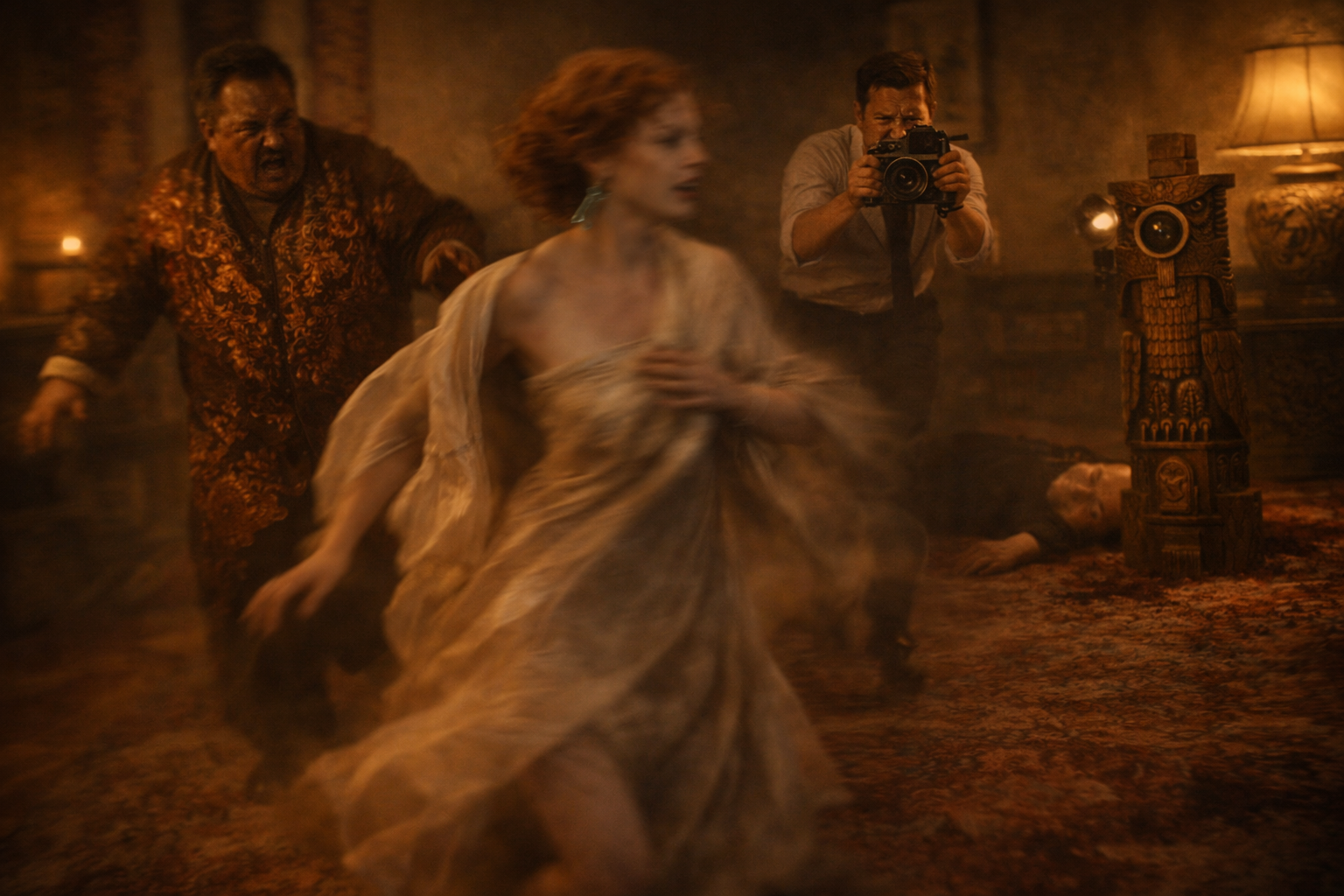 ウイスキーと|苛立ちで|腹を|満たして|床に|就き、|夢を|見た。||血まみれの|中国風の|上着を|着た|男が、|長い|翡翠の|イヤリングをした|裸の|女を|追いかけ、|私は|その後ろを|走りながら、|空の|カメラで|写真を|撮ろうとしていた。