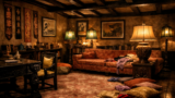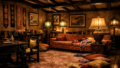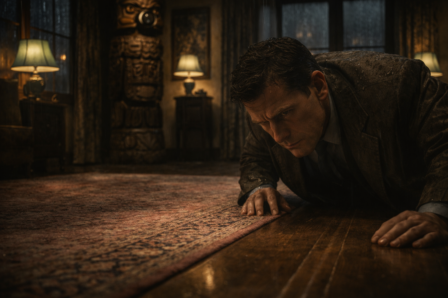 最初に|気づいたのは、|壁の|刺繍の|絹が|二枚|なくなっていることだった。||数えては|いなかったが、|茶色い|漆喰の|壁が|むきだしに|目立っていた。||もう|少し|進んで|別の|ランプを|つけた。||トーテムポールを|見た。||その|足元、|中国絨毯の|縁を|越えた|床の上に、|別の|絨毯が|敷かれていた。||さっきは|なかった。||さっきは|ガイガーの|死体が|あった。||ガイガーの|死体が|消えていた。