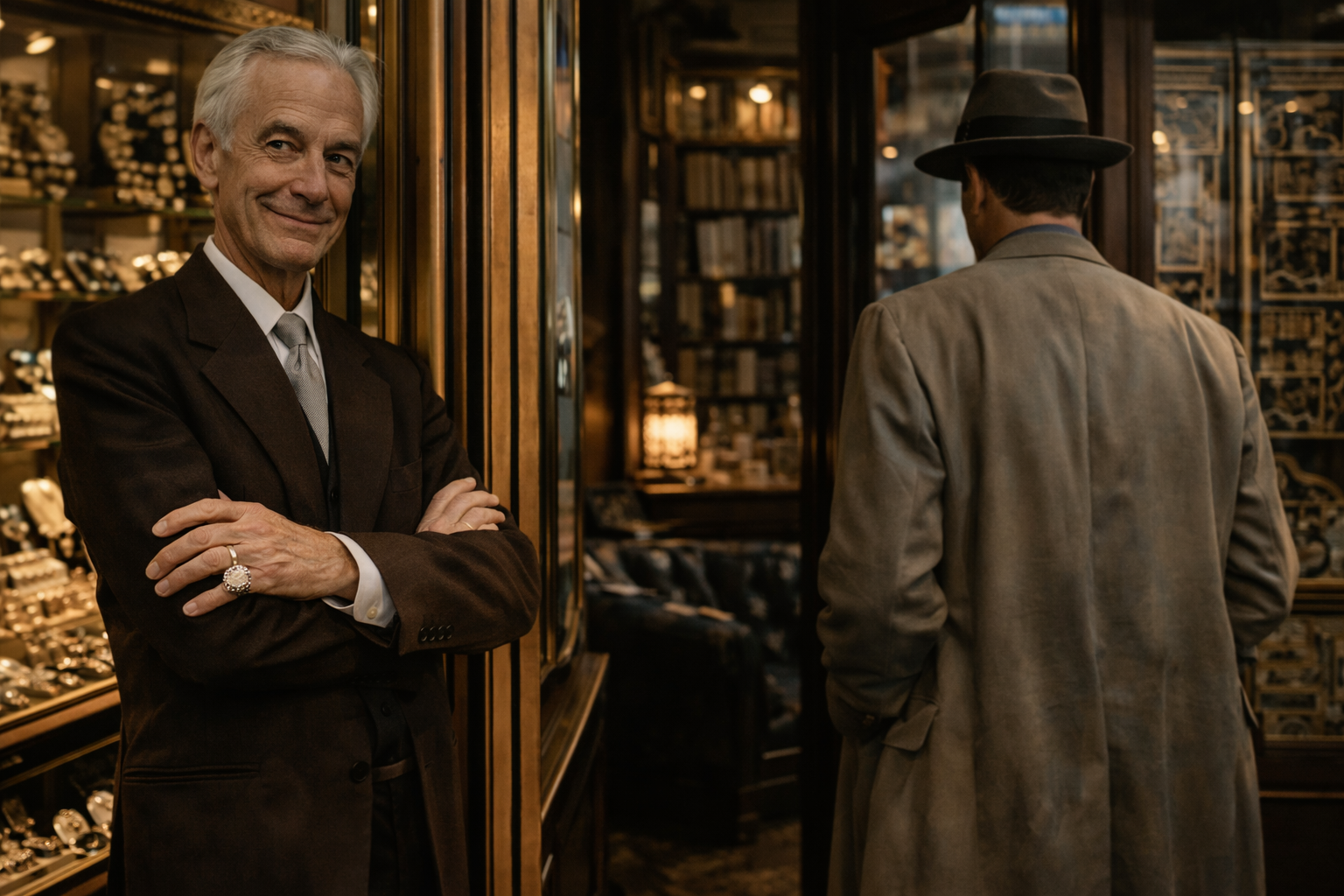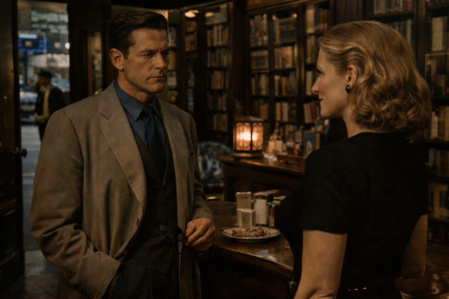 痩せた|黒い目の|掛け売り宝石商が、|前日の|午後と|同じ|場所に|入口に|立っていた。||私が|入ると|同じ|含み笑いを|向けてきた。||店は|まったく|同じだった。||隅の|小さな|机に|同じ|ランプが|灯り、|同じ|灰色がかった|ブロンドが|同じ|黒い|スエード風の|ドレスで|机の|後ろから|立ち上がり、|同じ|おずおずとした|笑みを|浮かべて|近づいてきた。