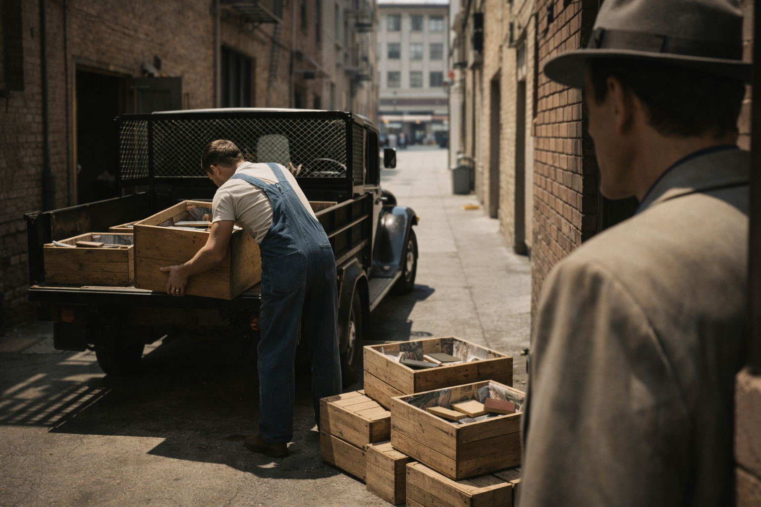 私は|店を|出て|大通りを|西へ|角まで|歩き、|店の|裏を|走る|路地へ|北に|折れた。||金属製の|格子の|側面に|文字の|ない|小さな|黒い|トラックが|ガイガーの|店の|裏に|バックで|止まっていた。||真新しい|オーバーオールの|男が|ちょうど|荷台に|箱を|積み上げていた。