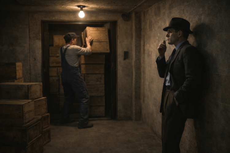 何か|言おうと|口を|開けた|とき、|仕切りの|扉が|少し|開いた。||ジャーキンを|着た|背の高い|黒髪の|男前の|若者が|顔を|出し、|蒼ざめた|顔で|唇を|固く|結んで、|私を|見ると|すぐに|扉を|閉めた。||だが|その前に、|後ろの|床に|新聞紙を|敷いて|本を|ゆるく|詰めた|木箱が|たくさん|あるのが|見えた。||真新しい|オーバーオールを|着た|男が|それを|いじっていた。||ガイガーの|在庫が|運び出されていた。
