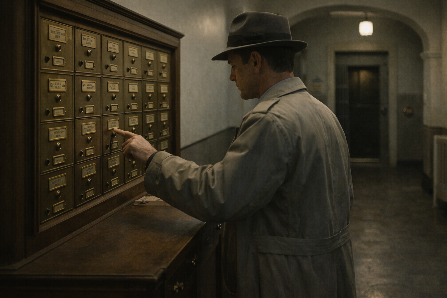 アパートの|正面に|回り、|私は|車を|降りた。||ロビーには|誰も|おらず、|交換台も|なかった。||木製の|受付台が|金色の|郵便受けの|パネルの|横の|壁に|寄せて|置いてあった。||名前を|見た。||ジョセフ・ブロディという|男が|405号室に|入っていた。||ジョー・ブロディという|男が|スターンウッド将軍から|五千ドルを|受け取り、|カーメンと|遊ぶのを|やめて|別の|女を|探すよう|言われていた。||同一人物かも|しれない。||まず|間違いないと|思った。