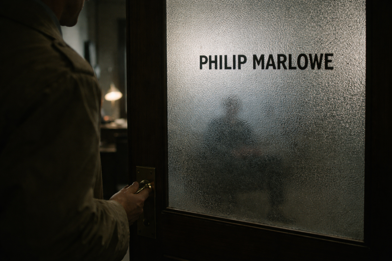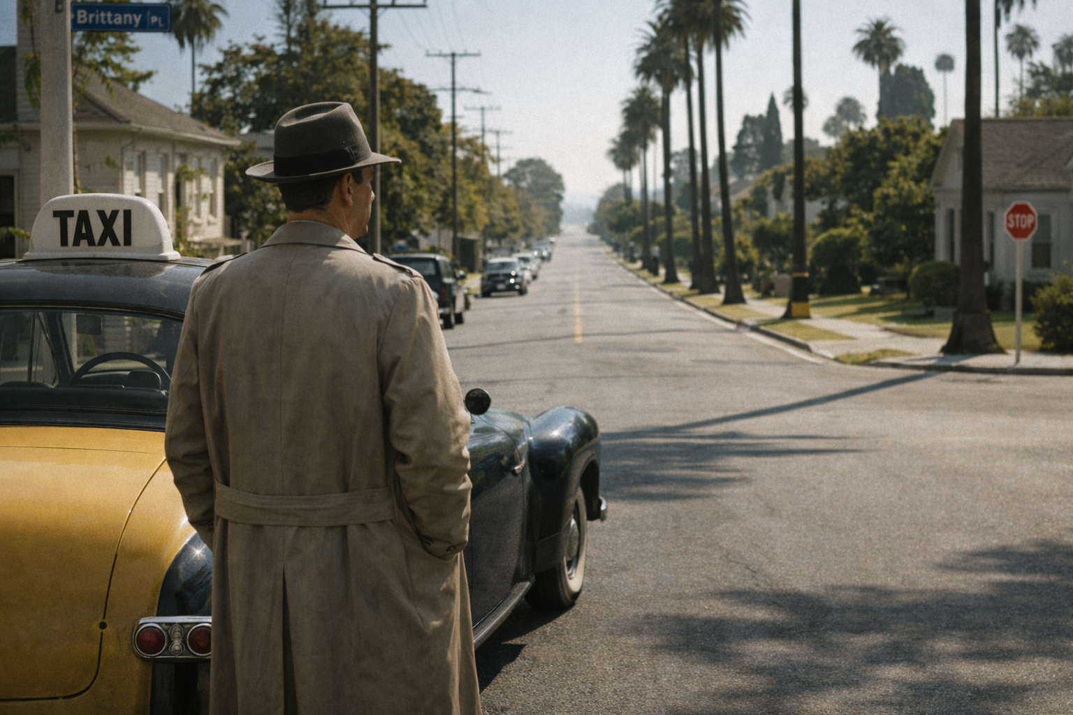 オーバーオールの|男は|エンジンを|吹かし、|路地の|両側を|ちらりと|見て|逆方向に|急発進した。||路地を|左に|出た。||こちらも|同じ|方向に|出た。||フランクリン通りを|東に|曲がる|トラックが|見えたので、|もう少し|詰めるよう|運転手に|言った。||できなかった|か、|しなかった。||フランクリンに|出たとき、|トラックは|二ブロック|先に|見えた。||ヴァイン通りまで、|ヴァインを|渡って、|ウエスタンまで|ずっと|見えていた。||ウエスタンを|過ぎてから|二度|見えた。||交通量が|多く、|顔の|若い|運転手は|離れすぎて|尾行していた。||遠慮なく|そう|言っている|うちに、|はるか|前方の|トラックが|また|北に|曲がった。||曲がった|通りは|ブリタニー・プレイス1と|いう|名だった。||ブリタニー・プレイスに|着いたとき、|トラックは|消えていた。