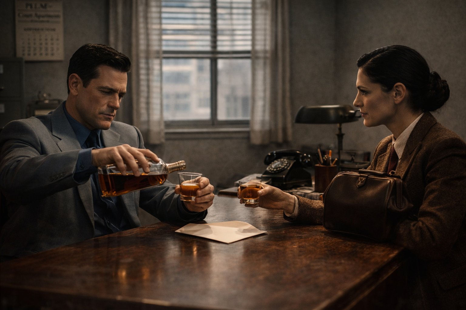 深い|引き出しの|鍵を|開けて|事務所用の|ボトルと|小さな|グラスを|二つ|出した。||注いで|二人で|飲んだ。||彼女は|バッグを|パチンと|閉めて|椅子を|引いた。