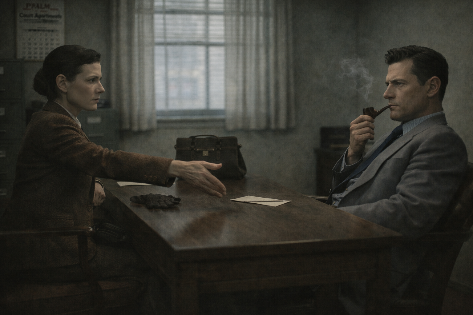 茶色の|斑入りの|ツイードに、|男風の|シャツと|ネクタイ、|頑丈な|ウォーキングシューズを|履いていた。||ストッキングは|前日と|同じくらい|薄かったが、|脚の|見え方は|少なかった。||黒い|髪は|茶色の|ロビンフッド帽の|下で|艶やかに|光っていた。||五十ドルは|したかもしれないが、|机の|吸い取り紙を|片手で|作れそうな|代物だった。