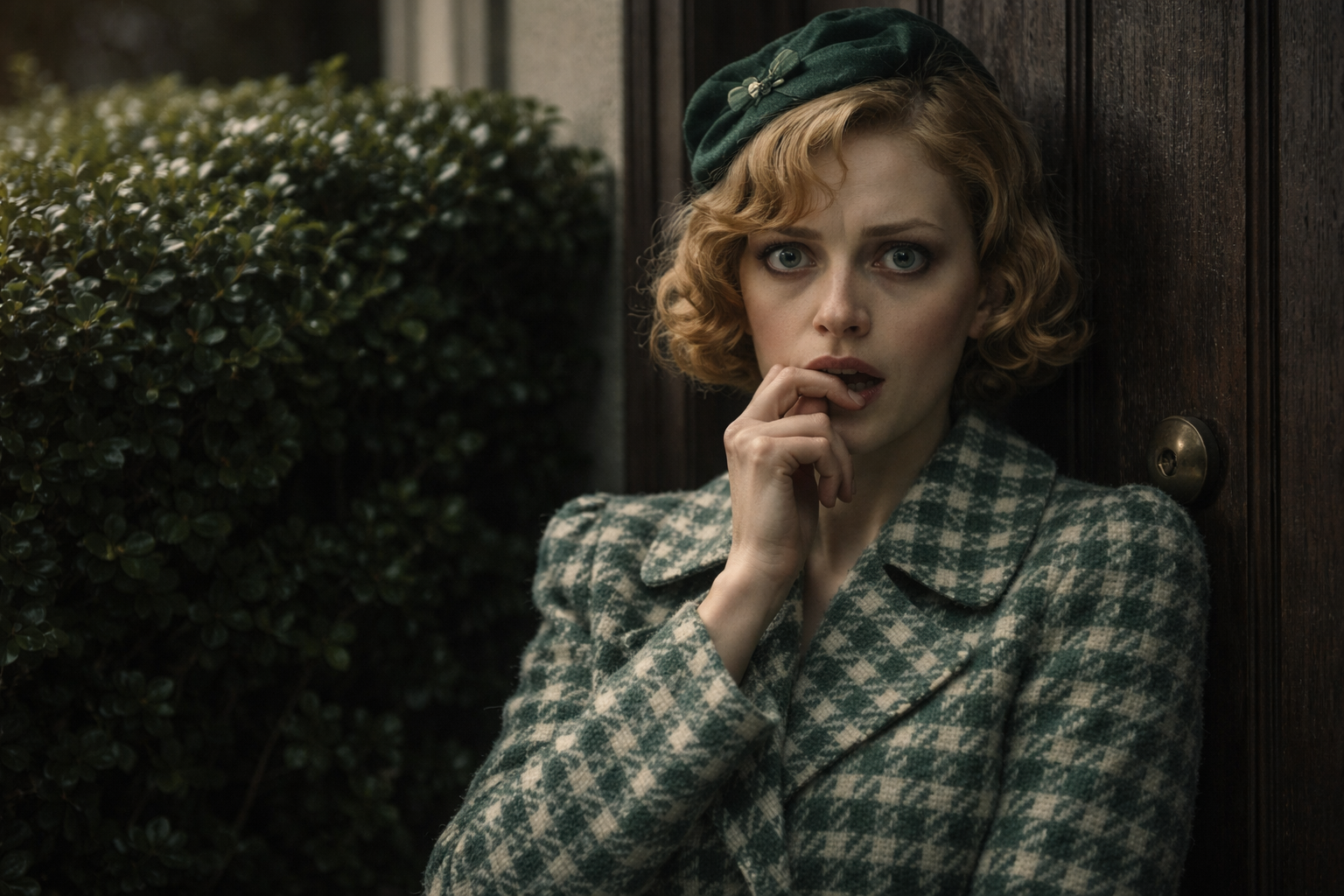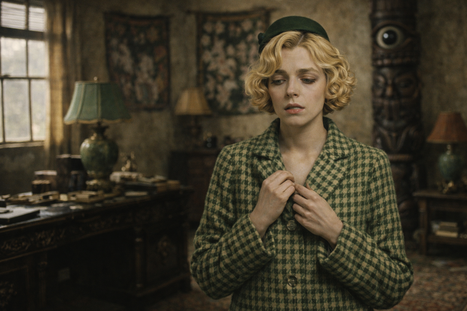 ガレージを|調べる|機会は|なかった。||扉は|閉まって|南京錠が|かかっており、|真横に|来た|とき|生垣の|陰で|何かが|動いた。||緑と|白の|チェックの|コートを|着て、|柔らかい|ブロンドの|髪に|小さな|ボタンのような|帽子を|かぶった|女が|迷路から|出てきて、|車が|丘を|上って|来るのが|聞こえなかったかのように|目を|見開いて|私の|車を|見た。||それから|すばやく|振り返って|姿を|消した。||カーメン・スターンウッドだった、|もちろん。