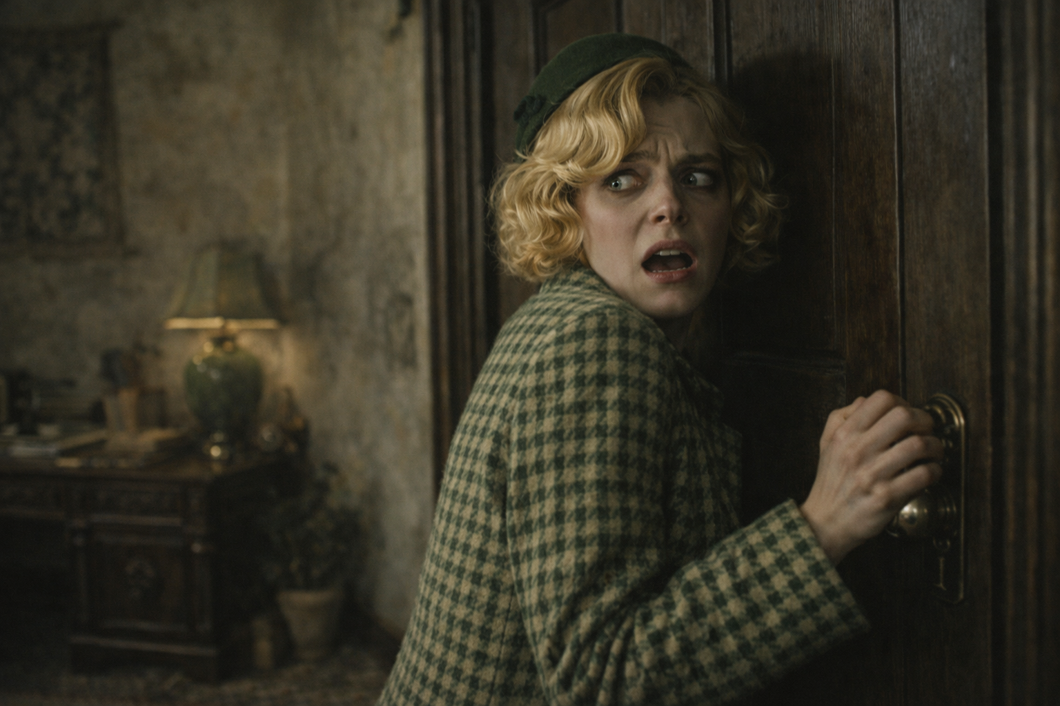 私は|動かなかった。||彼女は|もう一度|かわいい|目線を|くれて|玄関の|扉の|方へ|歩いた。||ノブに|手を|かけた|とき、|二人とも|車の|音を|聞いた。||彼女は|問いかける|目で|私を|見た。||私は|肩を|すくめた。||車が|止まった、|家の|真正面に。||恐怖が|彼女の|顔を|歪めた。||足音が|して|ベルが|鳴った。||カーメンは|肩越しに|私を|振り返り、|ドアノブを|握りしめ、|恐怖で|ほとんど|よだれを|垂らしそうだった。