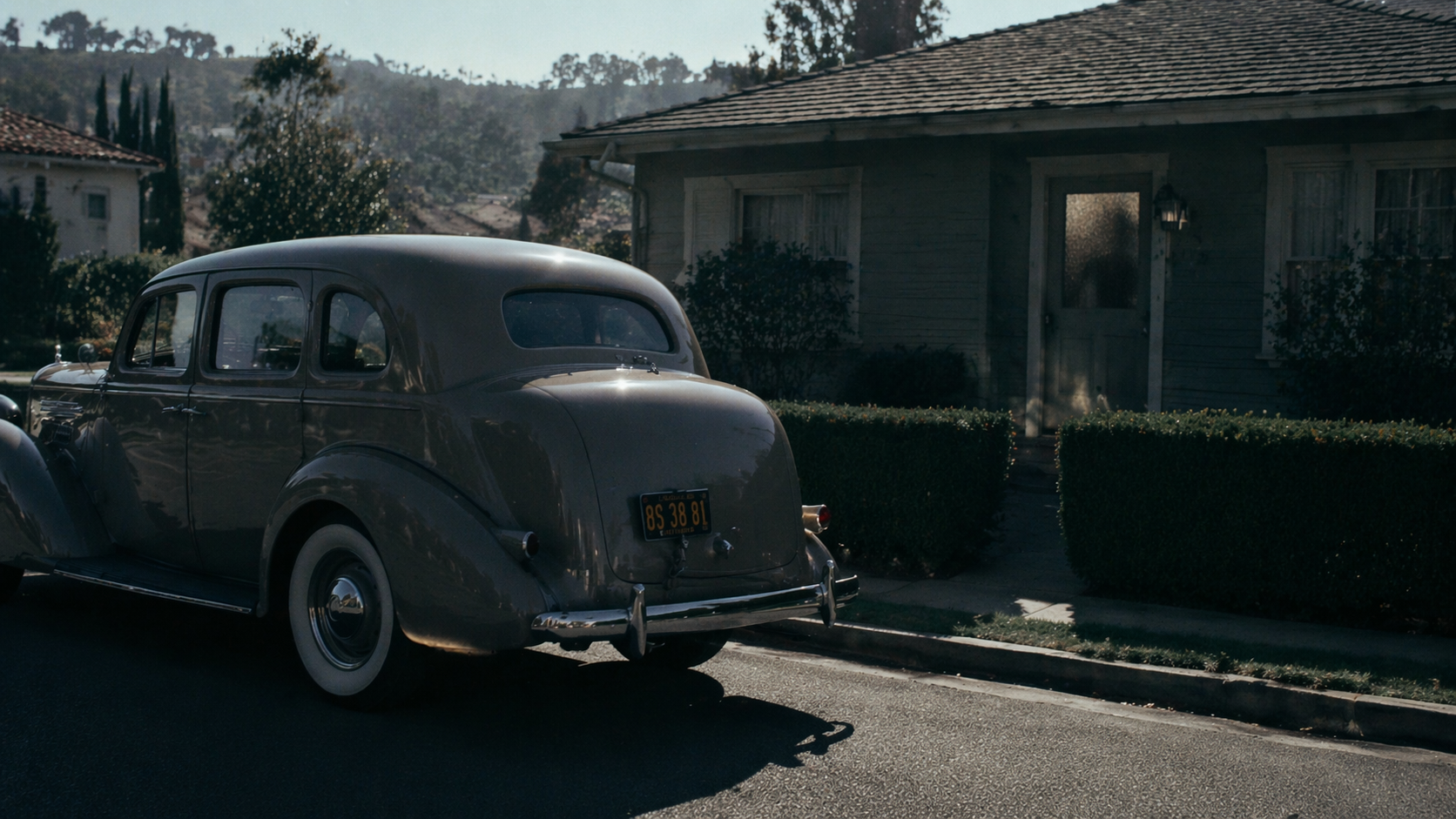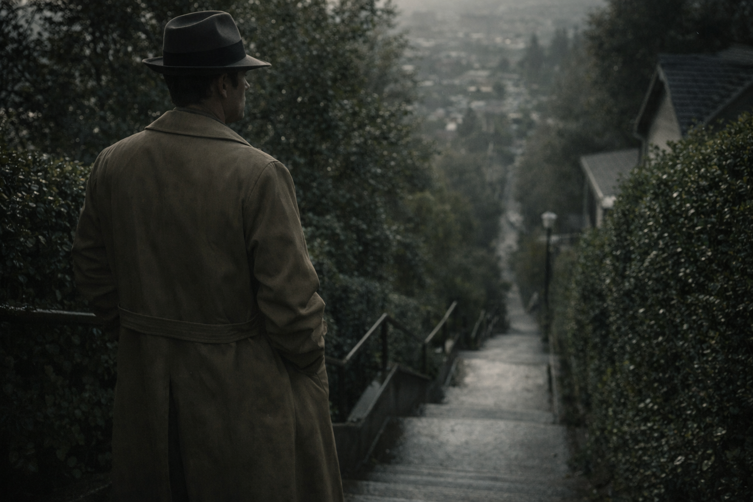 雨の|後、|ラヴァーン・テラスの|上手の|木々に|青々とした|葉が|茂っていた。||午後の|涼しい|陽光の|中で、|丘の|急な|斜面と、|殺し屋が|暗闇の中で|三発|撃った後に|駆け下りた|階段が|見えた。||下の|通りに|面した|二軒の|小さな|家が|あった。||銃声が|聞こえたかどうかは|わからない。