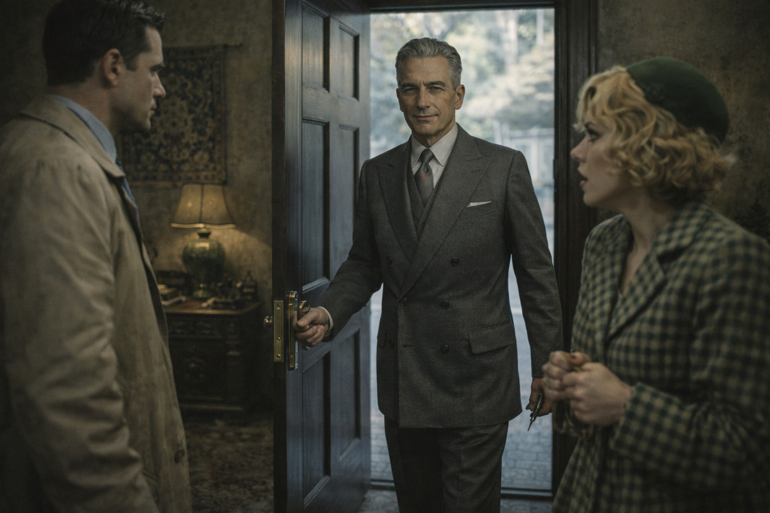 ||ベルは|鳴り続けた。||やがて|鳴り止んだ。||鍵が|扉を|かちりと|鳴らし、|カーメンは|扉から|飛びのいて|凍りついた。||扉が|勢いよく|開いた。||男が|さっそうと|入ってきて|ぴたりと|止まり、|完全な|落ち着きで|静かに|私たちを|見た。
