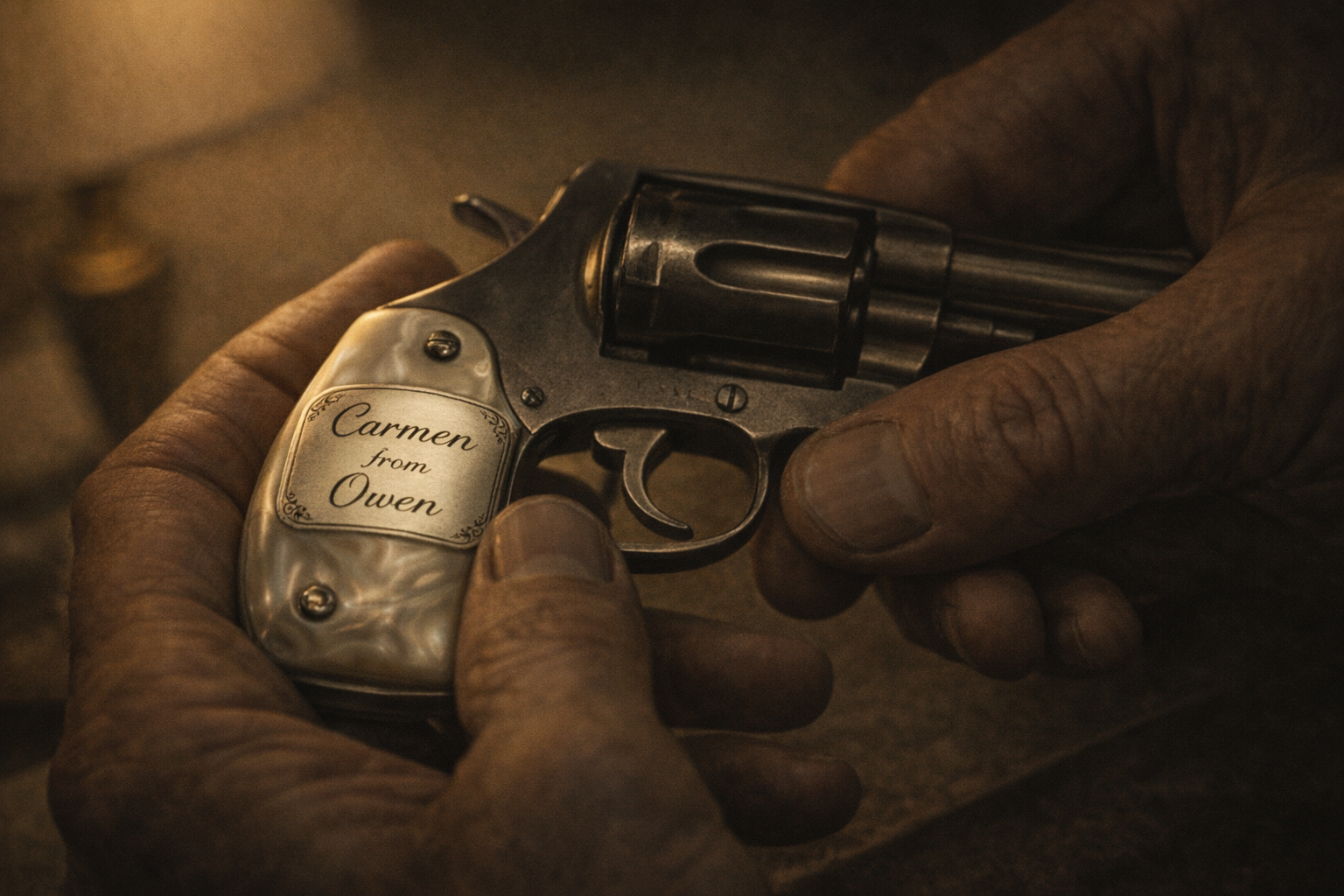 折り畳まれた|フレンチウィンドウに|近づき、|上部の|小さな|割れた|ガラスを|見た。||カーメンの|銃の|弾が|殴りつけたように|ガラスを|砕いていた。||穴は|開いていなかった。||漆喰に|小さな|穴が|あり、|目の|鋭い|者なら|すぐに|見つけるだろう。||ドレープを|割れた|ガラスの|上に|引いて、|ポケットから|カーメンの|銃を|取り出した。||バンカーズ・スペシャル、|二十二口径、|ホローポイント弾。||真珠の|グリップで、|銃把に|はめ込まれた|小さな|丸い|銀板に|こう|刻まれていた。