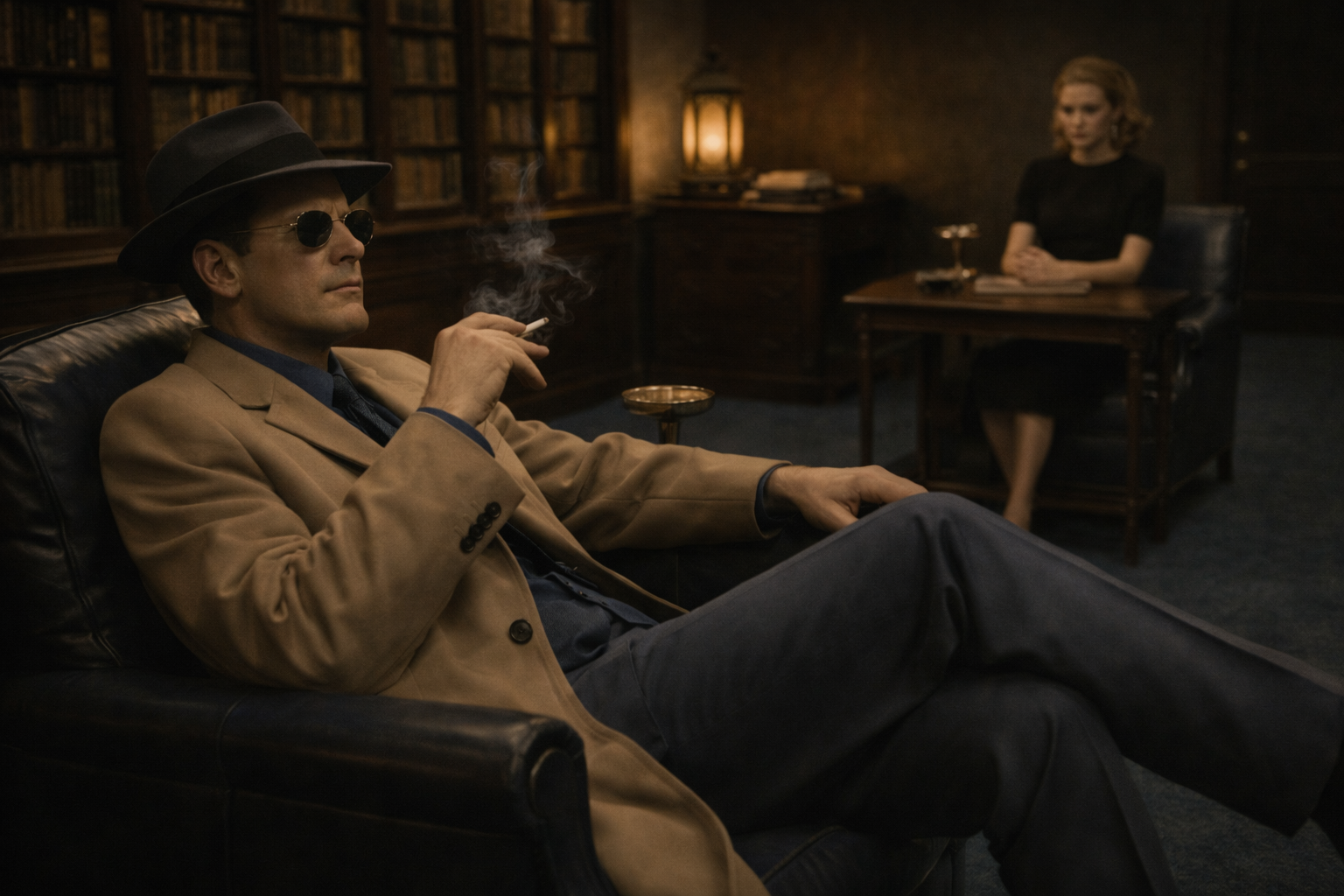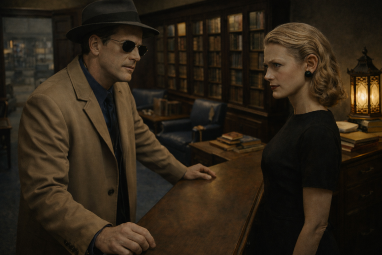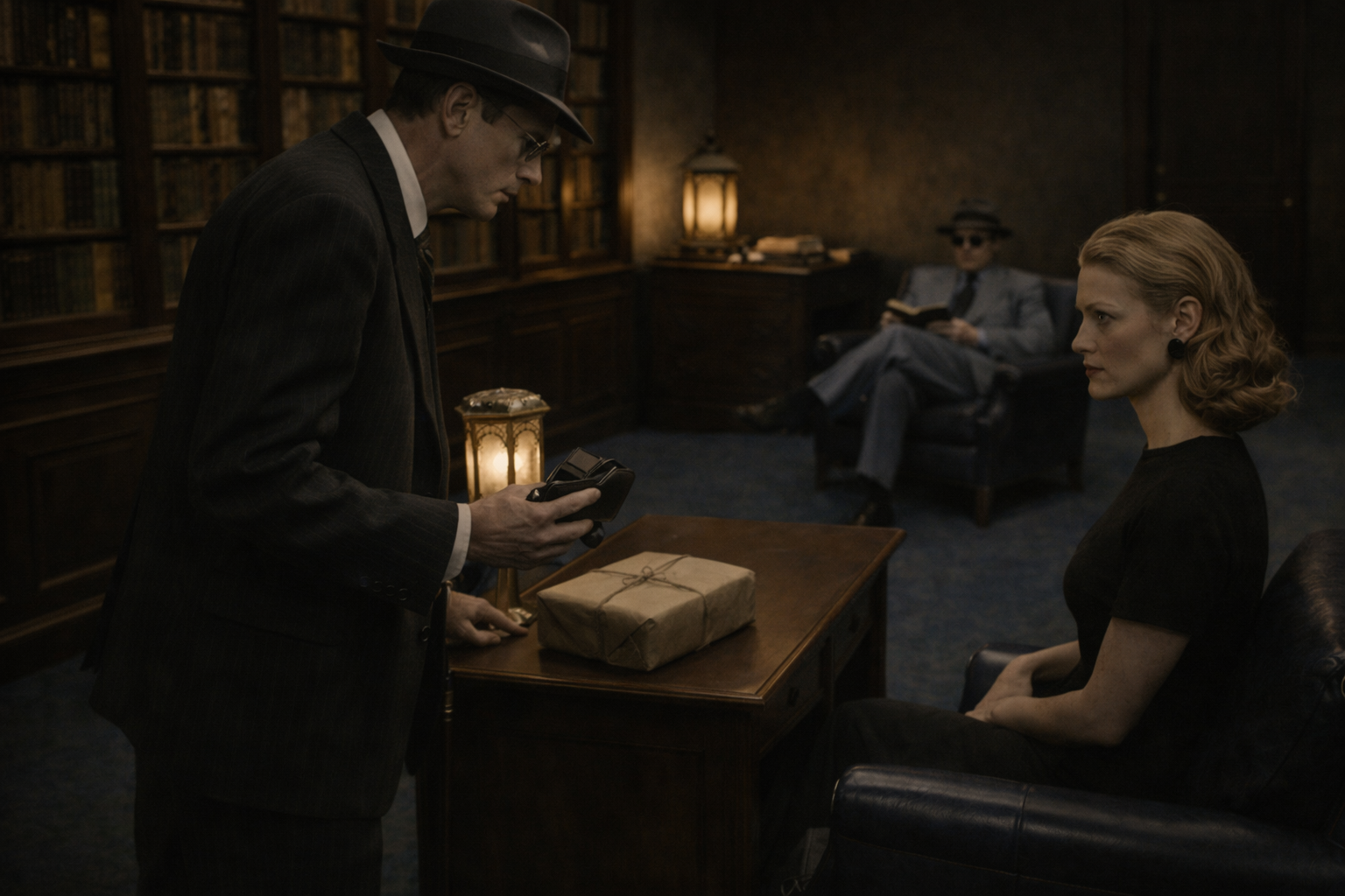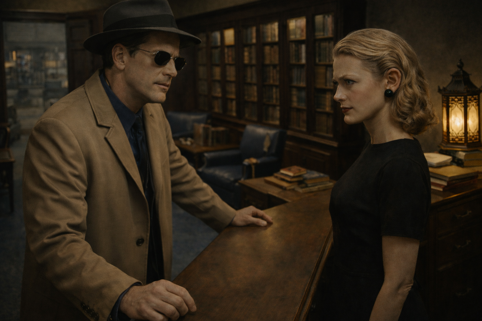 この場面では、マーロウが何も言わずに店を出るときに、ブロンドの女店員に対して軽く帽子を傾けて別れを告げています。さんざん困らせておきながら、最後にさりげなく礼儀を見せるというマーロウらしい皮肉の効いた行動です。