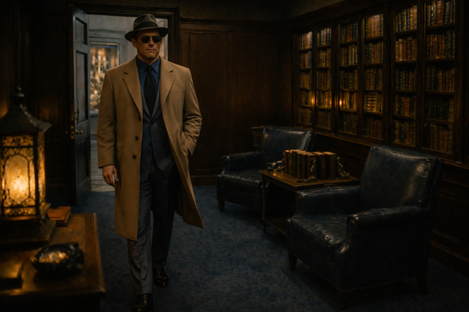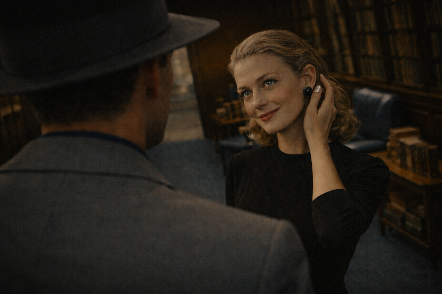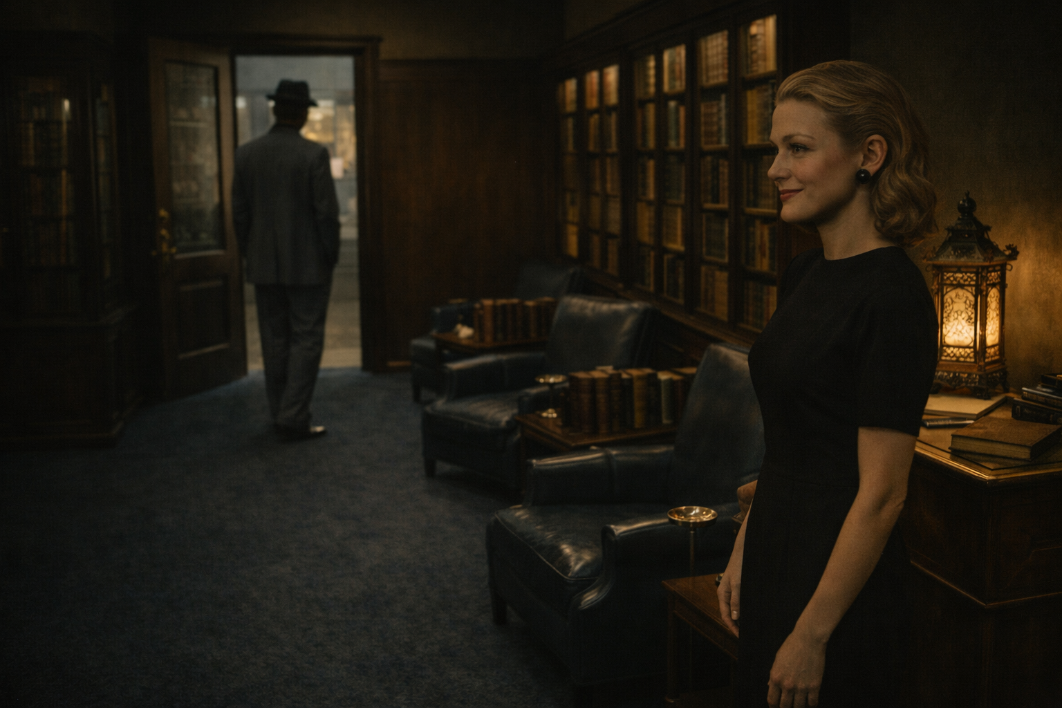 この場面では、マーロウが何も言わずに店を出るときに、ブロンドの女店員に対して軽く帽子を傾けて別れを告げています。さんざん困らせておきながら、最後にさりげなく礼儀を見せるというマーロウらしい皮肉の効いた行動です。