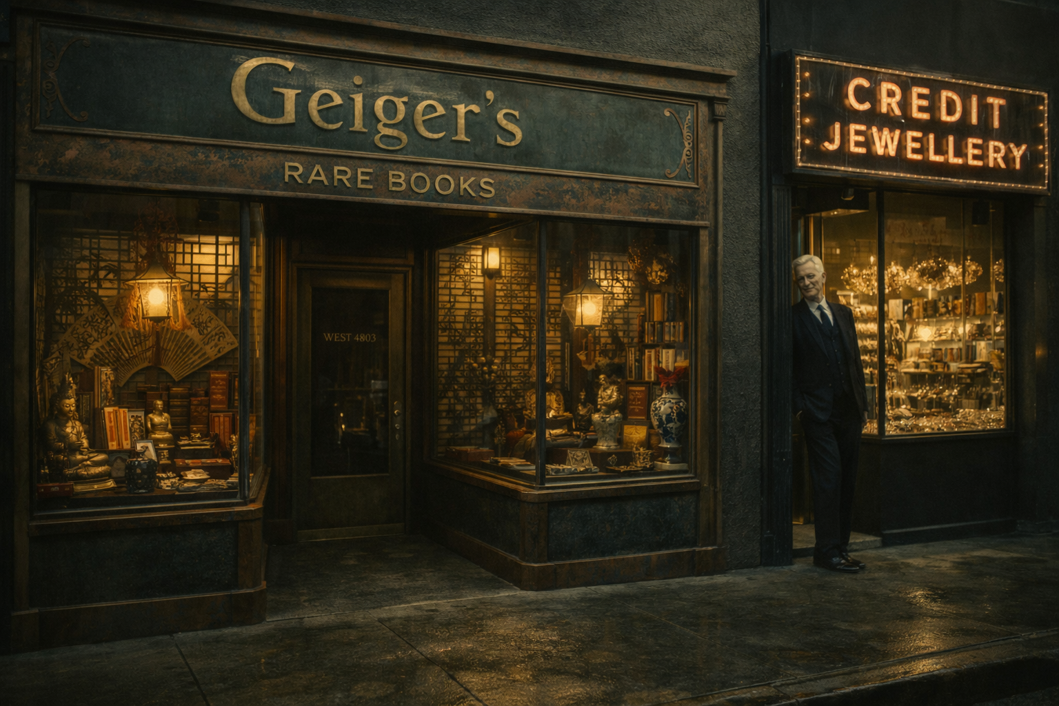 A・G・ガイガーの|店は|ラス・パルマス1近くの|大通りの|北側に|あった。||入口の|扉は|中央に|奥まって|設けられ、|窓には|銅の|縁取りが|施され、|中国の|屏風で|塞がれていた。||店の|中は|見えなかった。||ウィンドウには|東洋風の|がらくたが|並んでいた。||価値が|あるかどうかは|わからなかった。||骨董品の|収集家では|ないので。||未払いの|請求書なら|別だが。||入口の|扉は|板ガラスだったが、|店が|とても|薄暗いので|それほど|見えなかった。