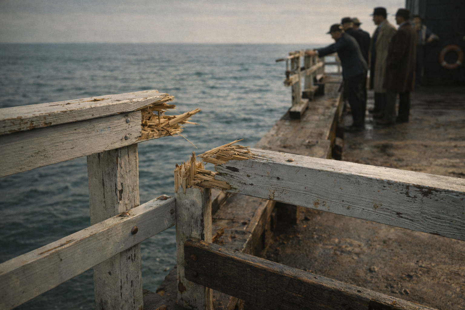 制服の|男が|桟橋の|端で|野次馬が|群がっている|場所を|指さした。||一人が|白い|角材が|広い|範囲で|突き破られた|箇所を|触っていた。||割れた|木は|黄色く|きれいで、|切りたての|松のようだった。