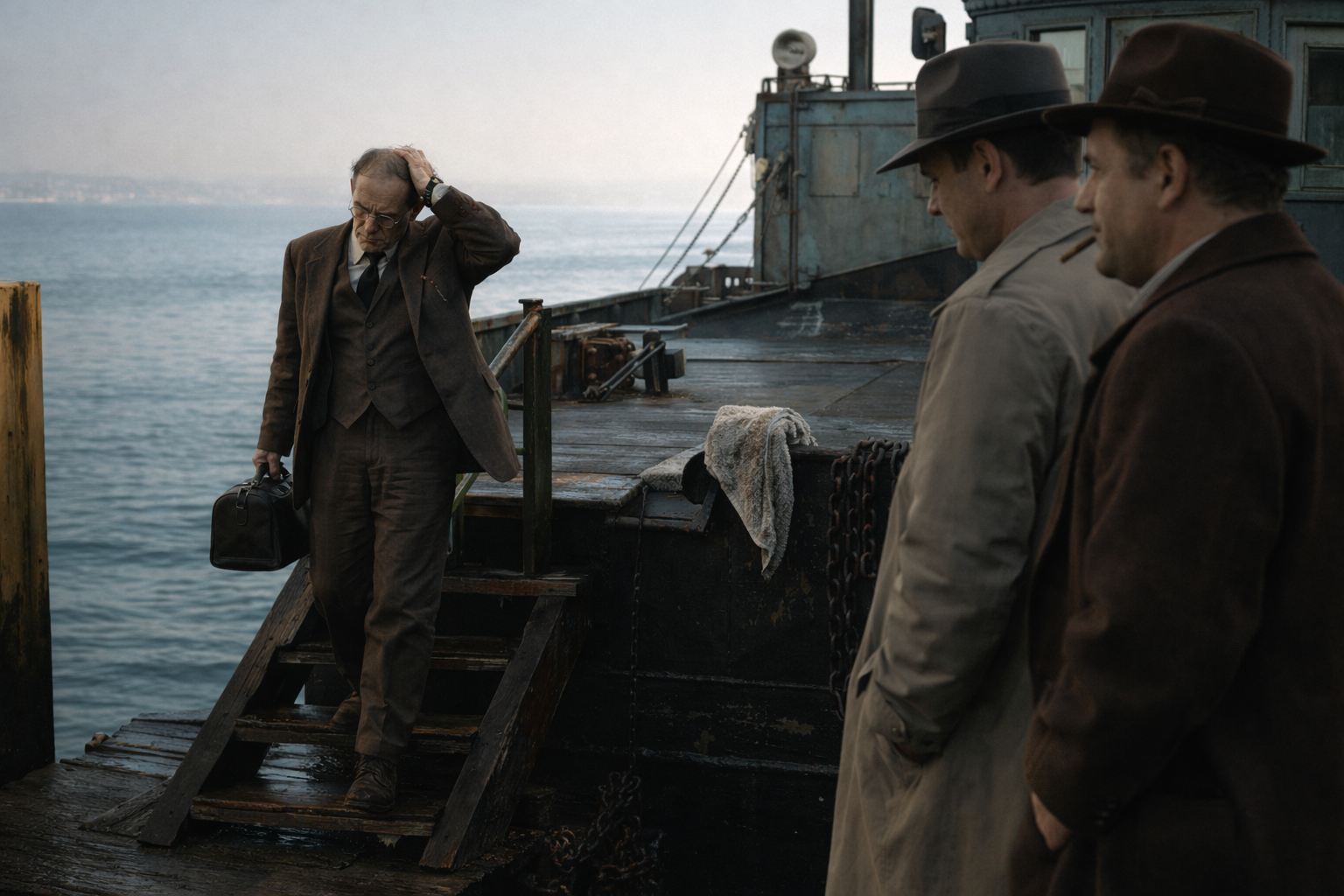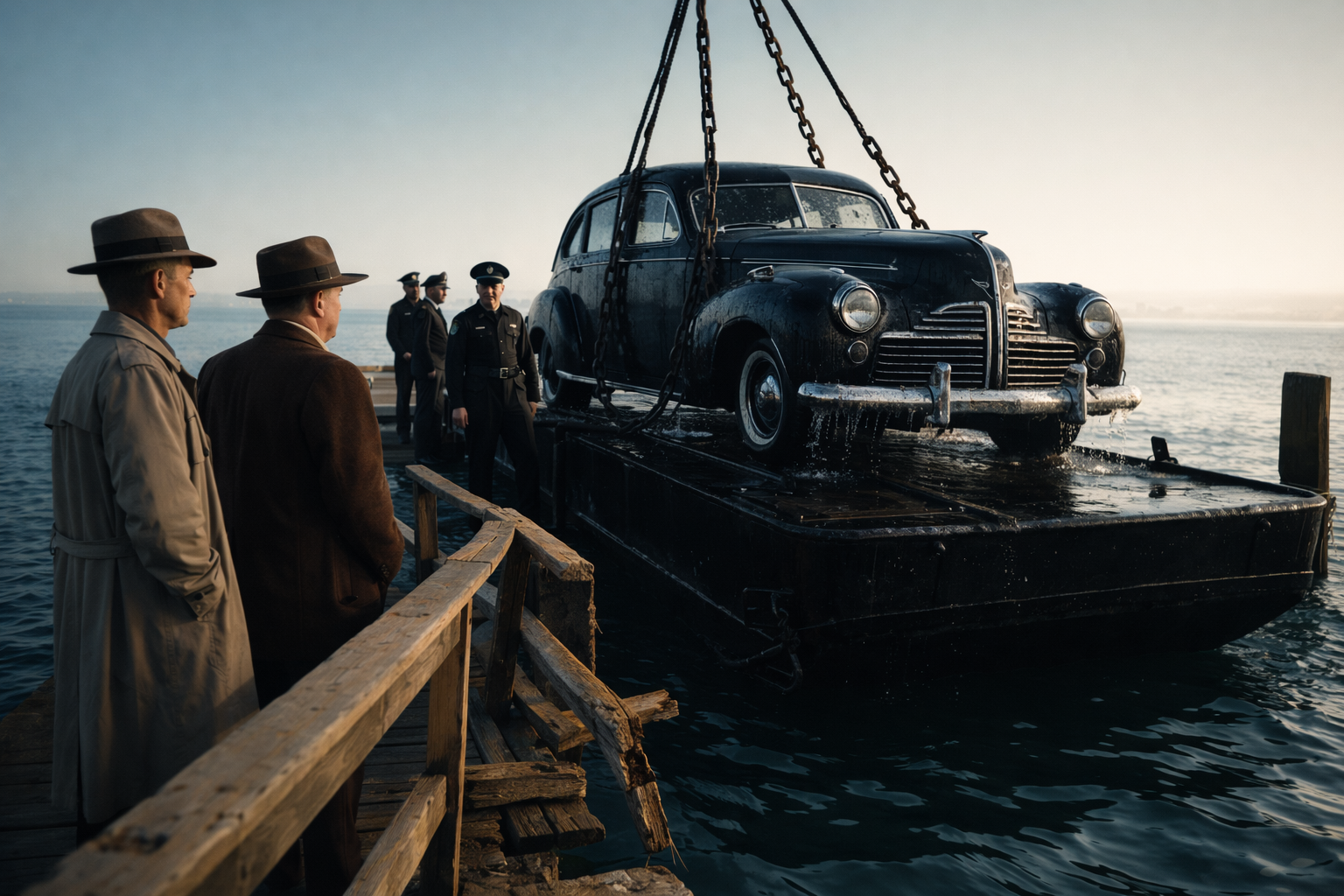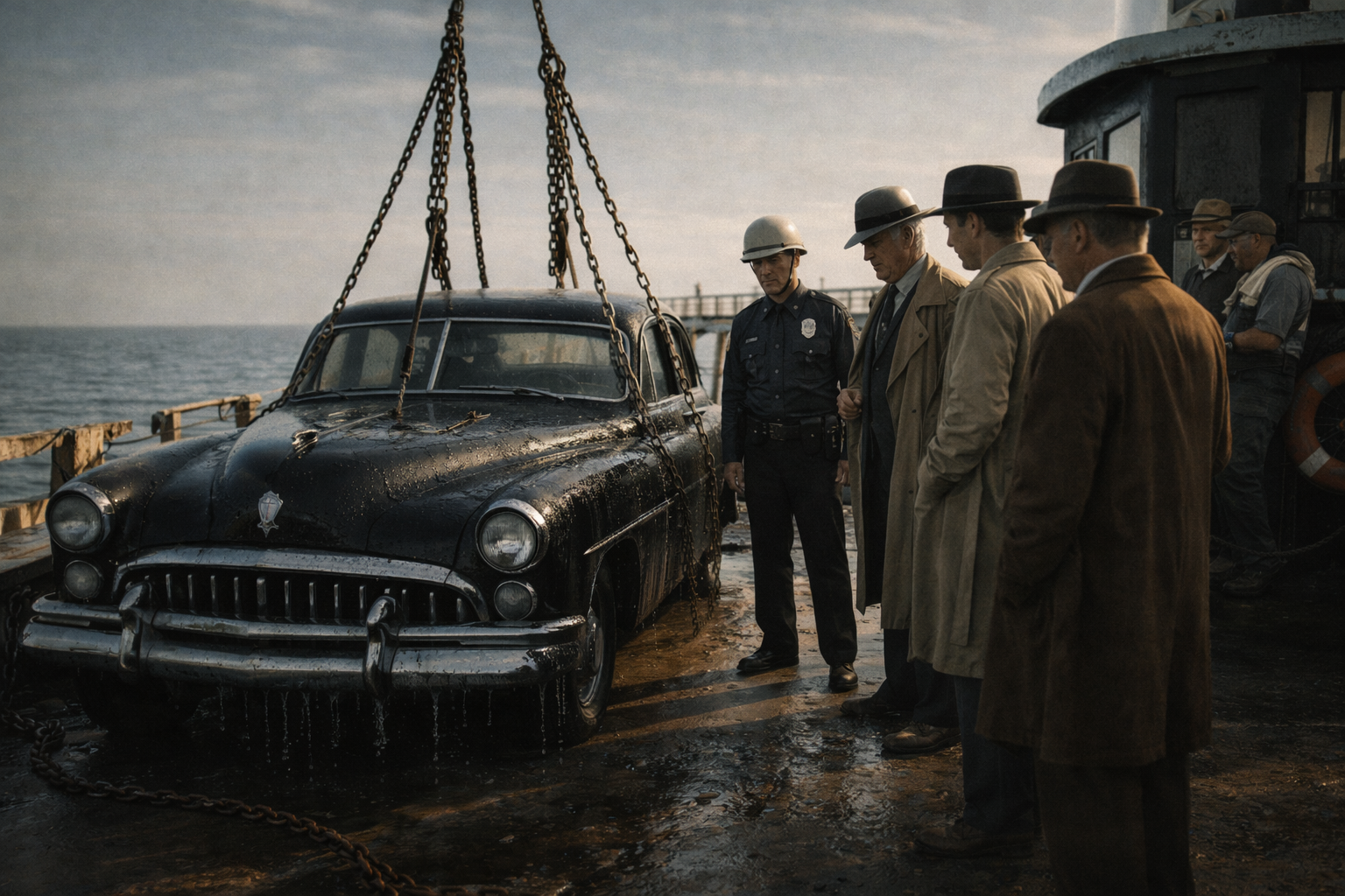 桟橋の|突端の|杭に|寄り添うように、|タグボートのような|操舵室を|持つ|低い|黒い|引き上げ船が|うずくまっていた。||甲板の上に|朝の|日差しを|受けて|光る|ものが|あった。||巻き上げチェーンを|巻かれたまま|の、|大きな|黒と|クロームの|車だ。||巻き上げ機の|アームは|元の|位置に|戻され、|甲板の|高さまで|下ろされていた。||男たちが|車の|周りに|立っていた。||滑る|階段を|降りて|甲板に|向かった。
