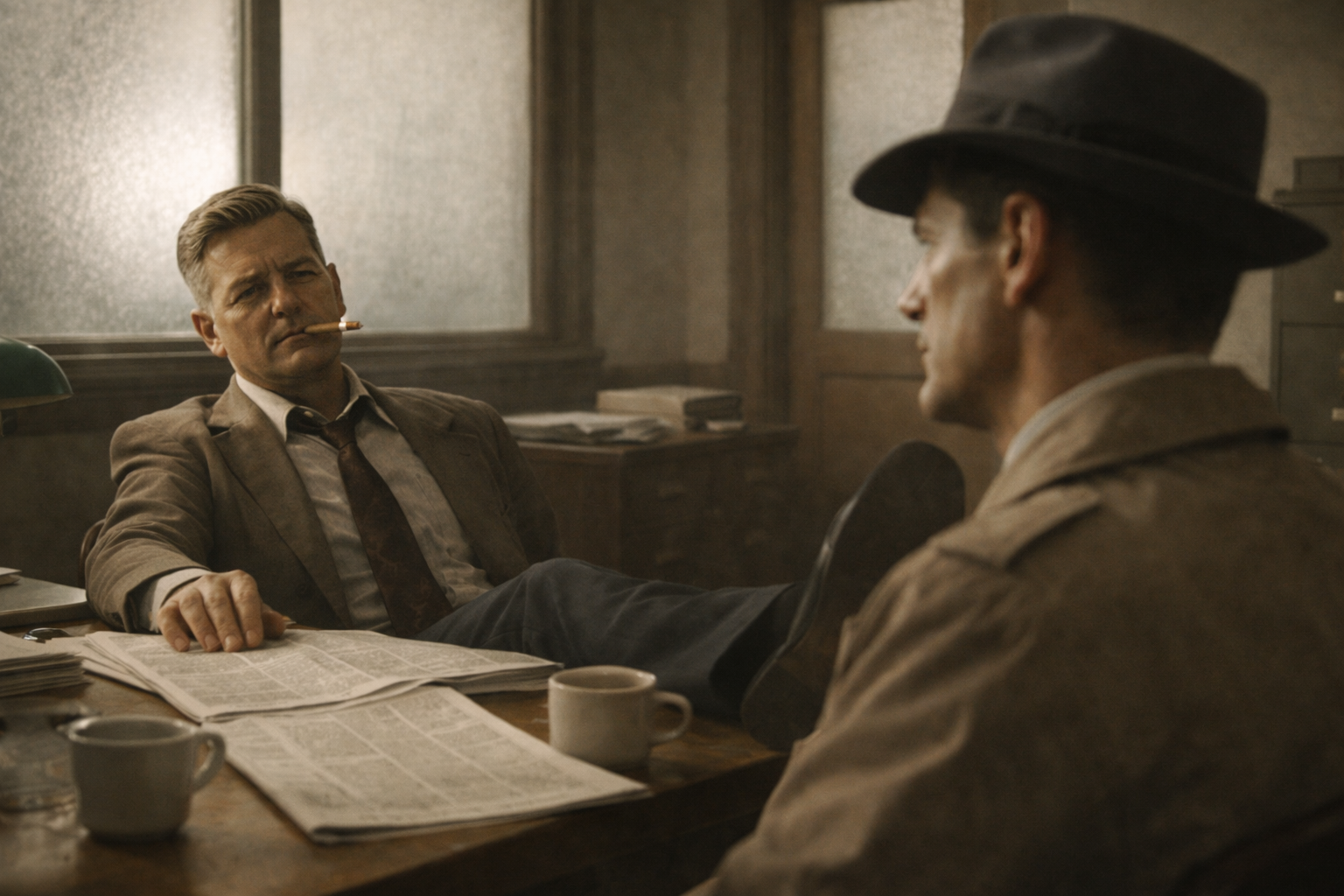 「やれやれ」|笑って、|それから|声が|少し|わざとらしく|さりげない|調子に|なった。||刑事の|声だ。||「スターンウッド将軍には|もう|会ったか?」
