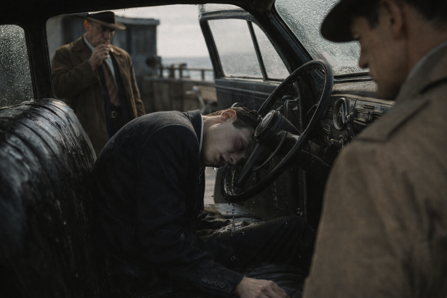 運転手は|まだ|ステアリングポストに|折り重なるように|して、|頭が|肩に対して|不自然な|角度に|なっていた。||細身の|黒髪の|若者で、|つい|最近まで|男前だったはずだ。||今は|顔が|青白く、|伏せた|瞼の|下に|目が|かすかに|鈍く|光り、|開いた|口の中に|砂が|入っていた。||左の|こめかみに|鈍い|打撲傷が|白い|皮膚の上に|浮かんでいた。