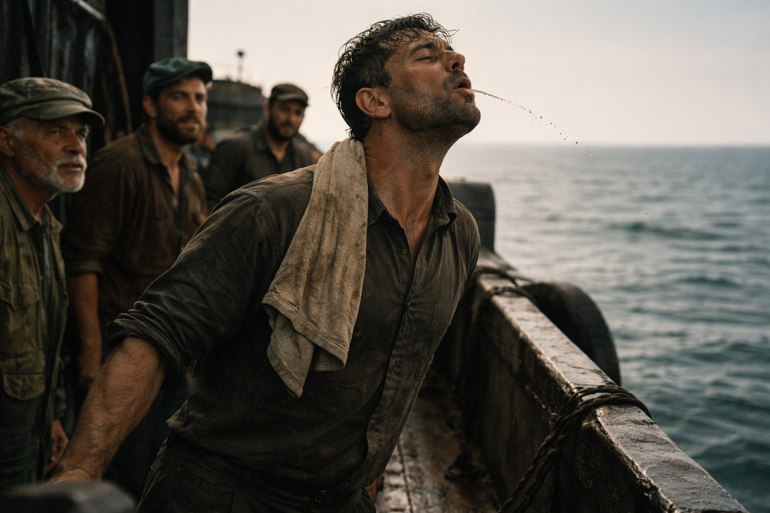 オールズが|緑の|カーキ服を|着た|副官と|私服の|男に|挨拶した。||艀の|乗組員が|三人、|操舵室の|前に|もたれて|タバコを|噛んでいた。||一人が|汚れた|バスタオルで|濡れた|髪を|こすっていた。||チェーンを|かけるために|水に|潜った|男だろう。