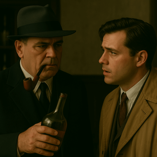 On ne vit plus l’inspecteur Leroy, qui porta avec précaution la bouteille et les verres dans sa chambre et passa la soirée à confectionner un emballage modèle, dont il avait le schéma en poche, étudié pour faire voyager les objets sans effacer les empreintes.