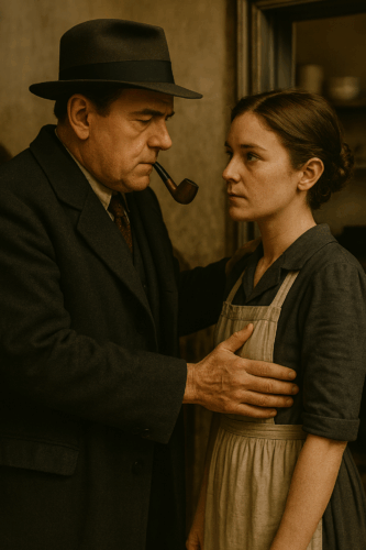その|瞬間、|メグレは|太い手で|彼女の|肩を|つかみ、|頑固そうで|ありながら、|どこか|温かい|まなざしで|彼女の|目を|まっすぐに|みつめた。。