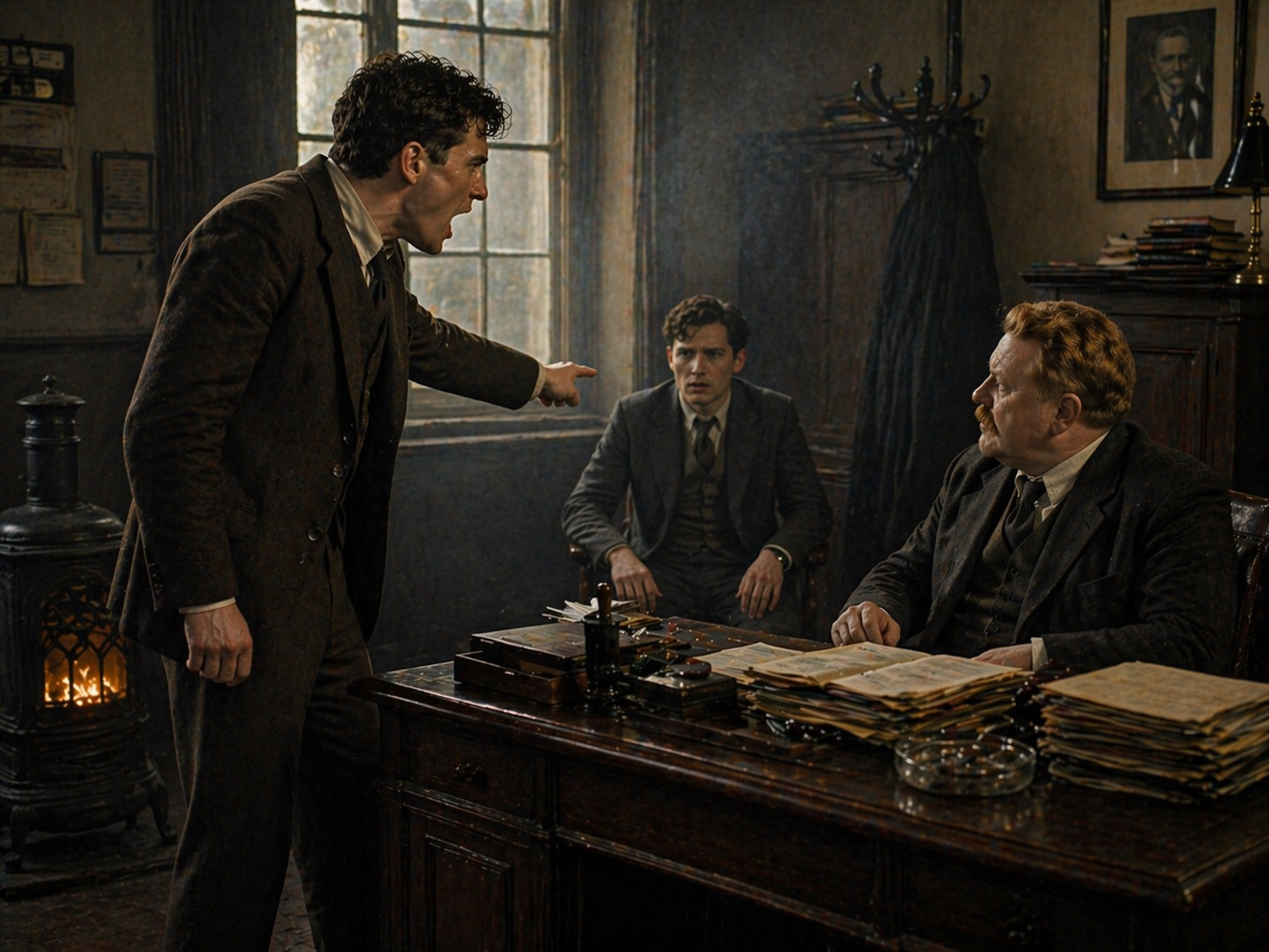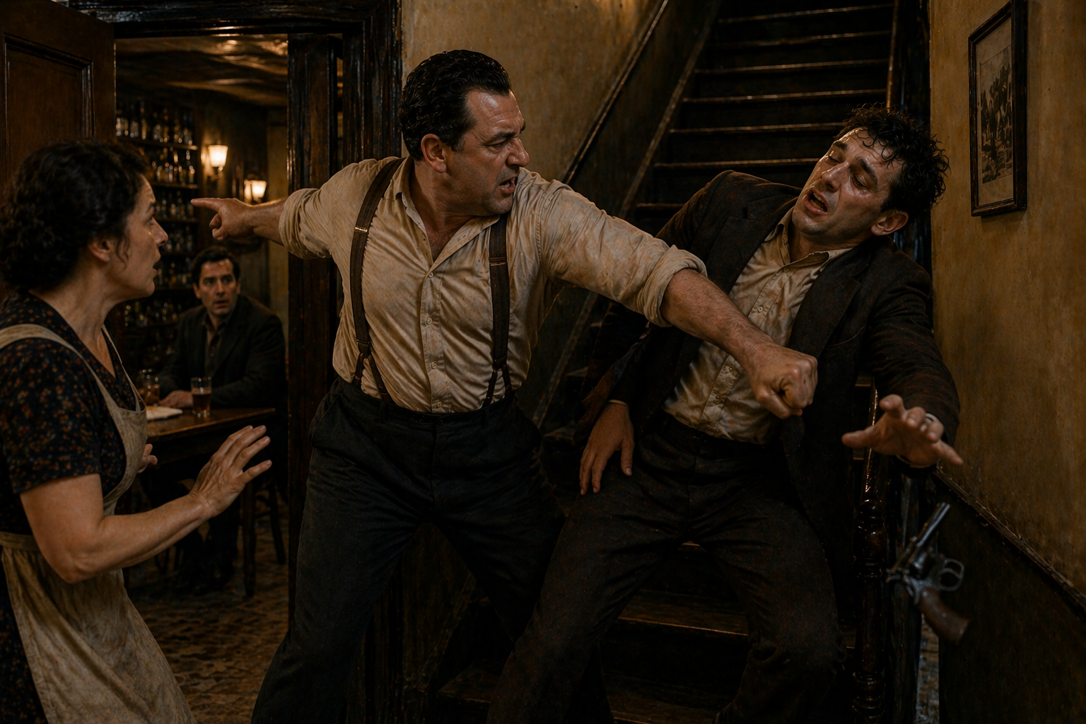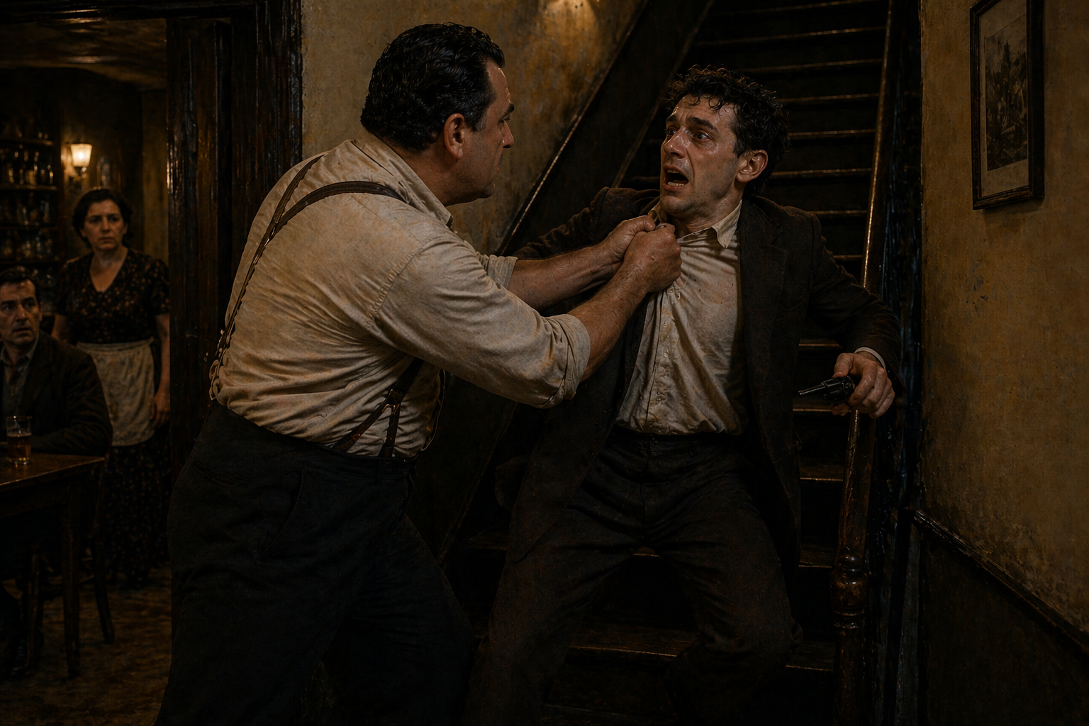 その|瞬間、|ほとんど|一場の|悲劇だった。||若い|男は|ポケットから|リヴォルヴァーを|引き抜き、|叫んだ。