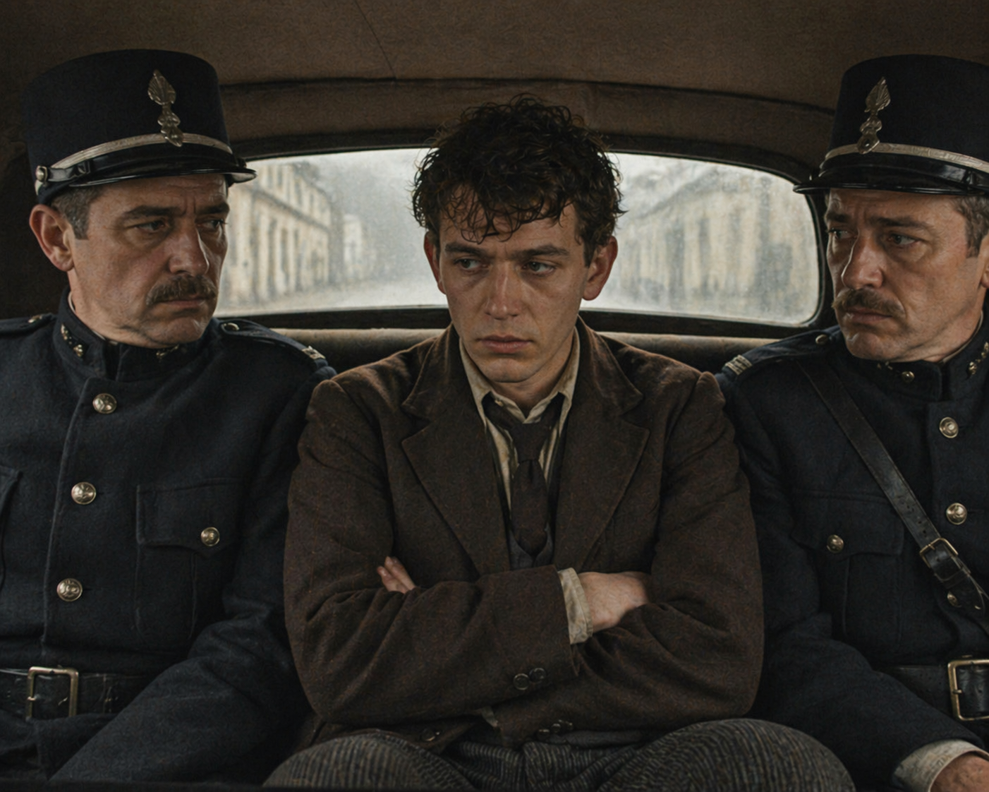 車の中で、|二人の|巡査に|はさまれた|デルフォスは、|最初は|頑なに|黙っていた。