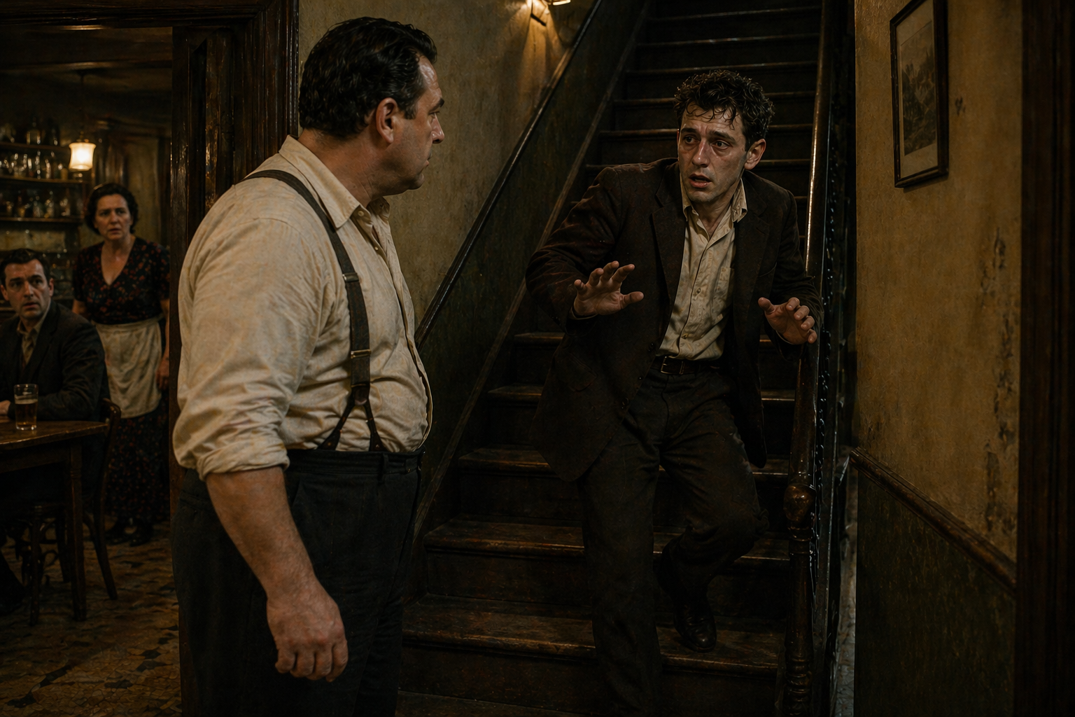 アンリは|まったく|動じて|いなかった。||動揺して|いたのは|若い|男の|ほうで、|言い争いを|続けながら|後ずさりで|階段を|降りていった。