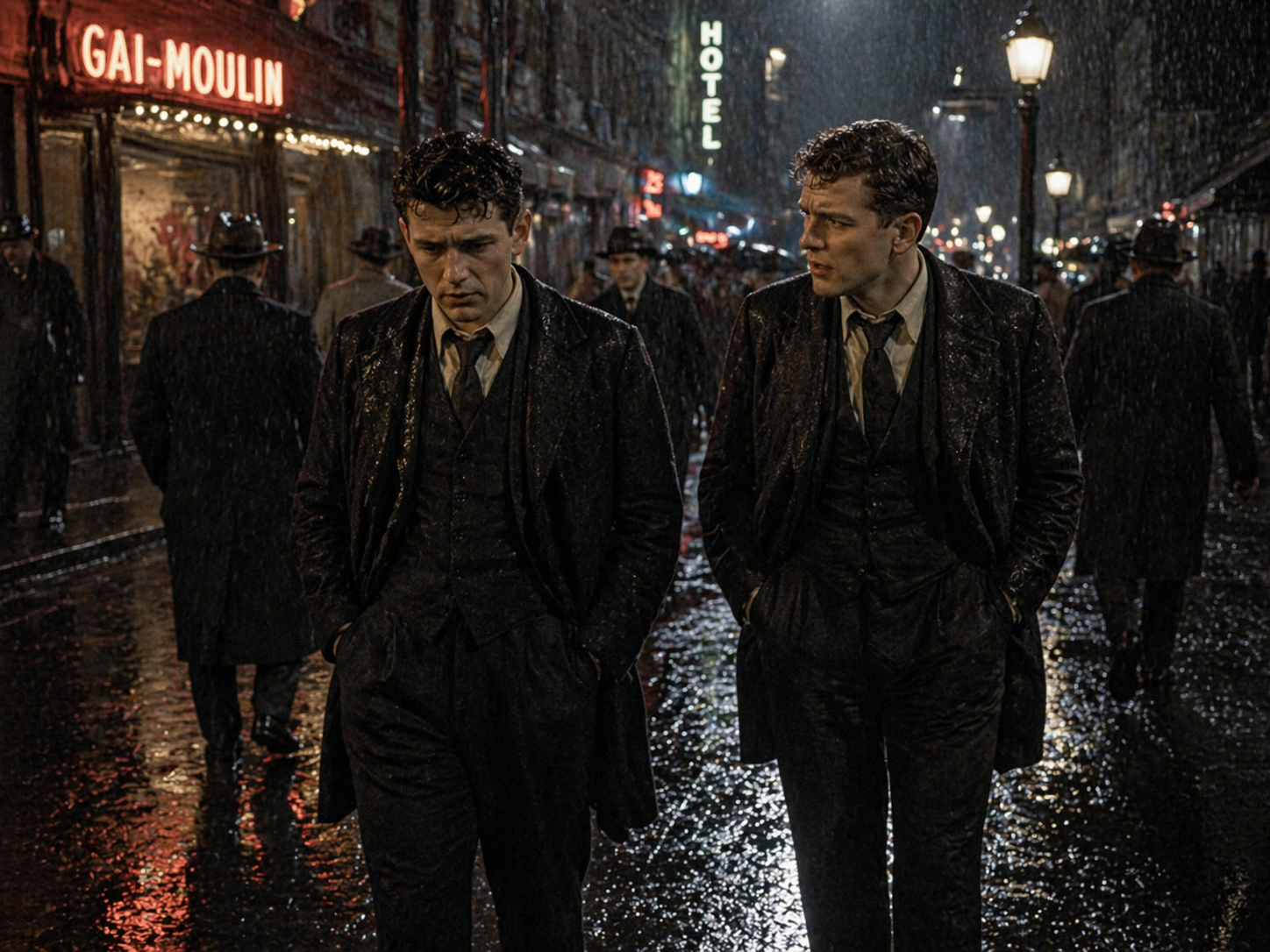雨が|降っていた。||通りでは、|シャボと|デルフォスが|歩道を|足早に|進み、|彼らを|知らない|群衆を|かき分けていた。