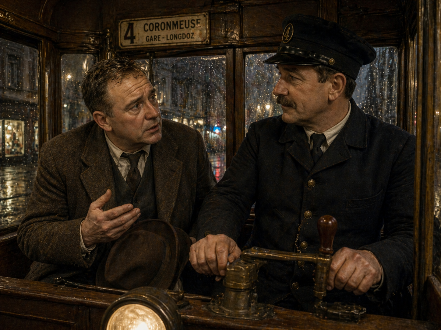- tram 4(四番電車) は、リエージュ市内を走る4番系統の路面電車です。||1930年代のリエージュには、市街地を結ぶ番号付きトラム路線網があり、行先や経路ごとに番号で呼ばれていました。息子の無実を知らされて興奮した父親が、事務所を飛び出し、いつもの四番電車に飛び乗って家へ急ぐ場面です。