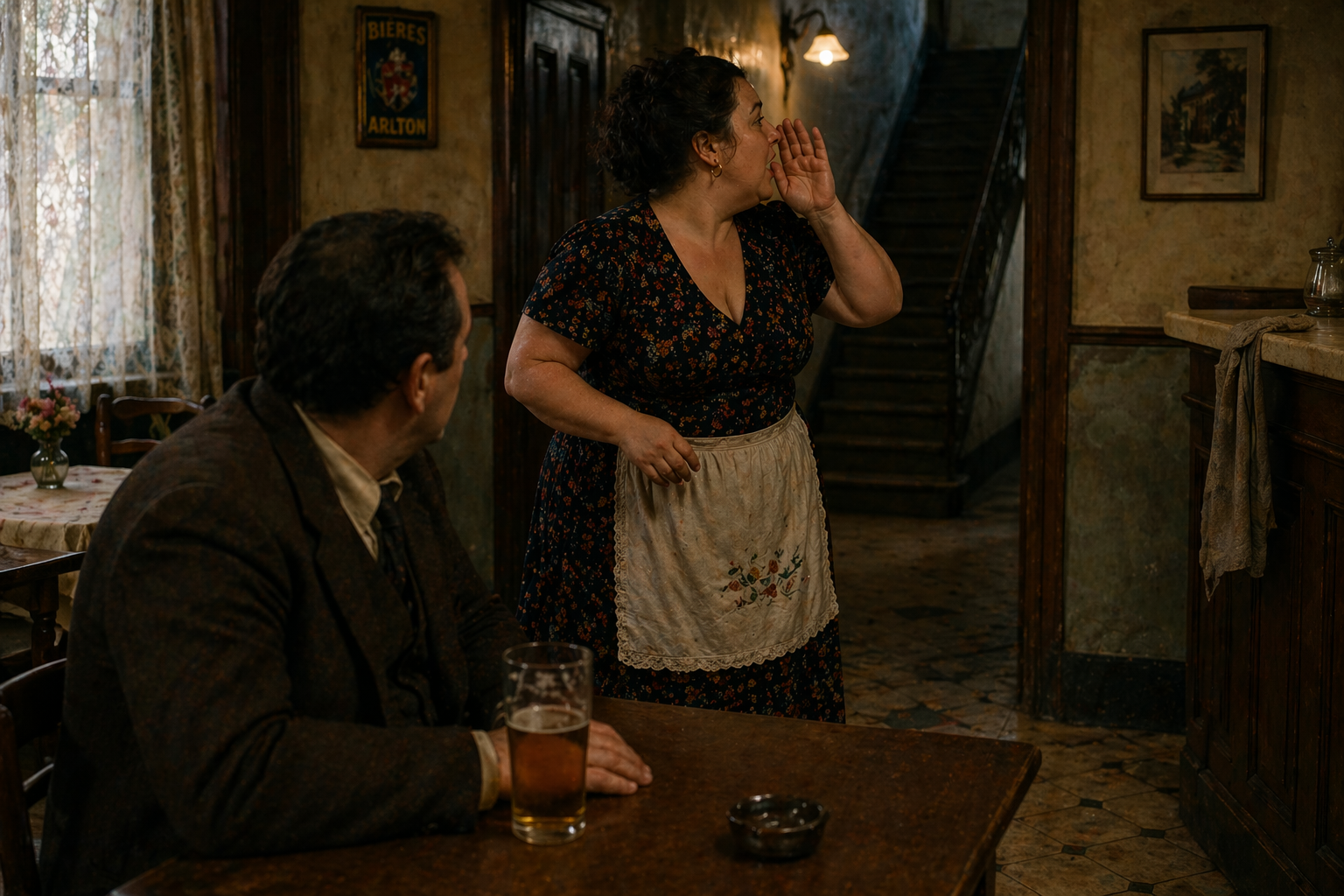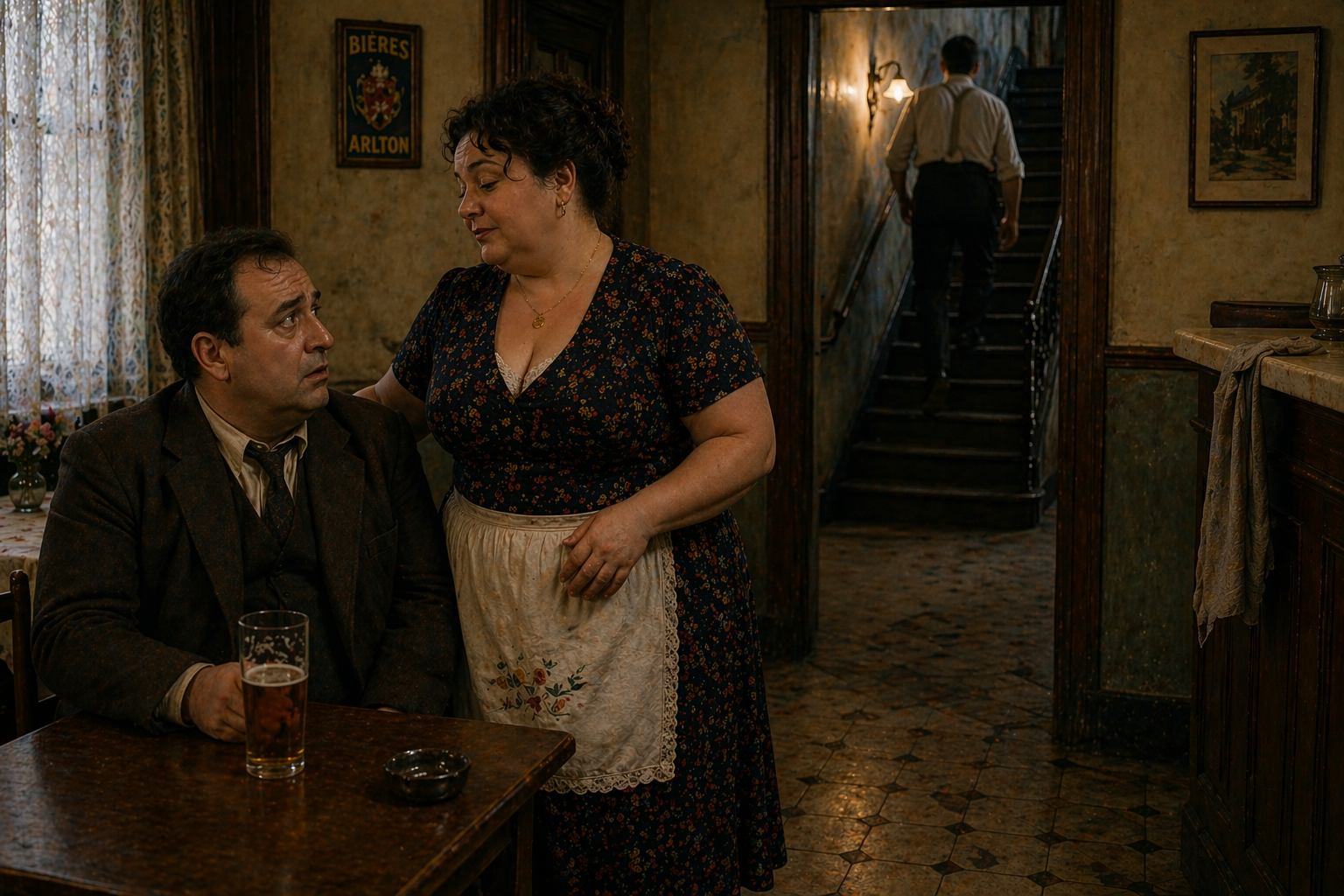 彼女が|客の|もとへ|戻ってくると、|客は|不安げで、|戸惑っていた。||さらに、|奥の|部屋から、|シャツ姿で、|付け襟もしていない|男が|現れ、|音もなく|階段へ|向かっていったため、|なおさらだった。||やがて|見えるのは|その|脚だけになり、|ついには|何も|見えなくなった。