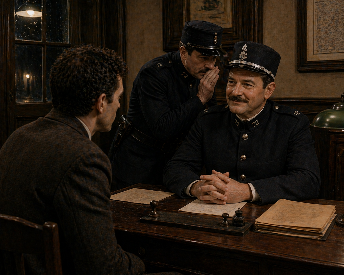 デルヴィーニュ警部は|不機嫌だった。||パリから|来た|同業者に|腹を|立てていた。