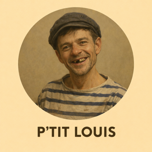 A portrait icon of P’tit Louis, a small wiry French sailor in his thirties or forties, appearing much older than his age. He is no taller or broader than a sixteen-year-old boy, with a lean, weathered face, irregular features, several missing teeth visible in a cocky grin, and three days of stubble on his cheeks. His eyes are bright and glassy with drunkenness, sharp and mischievous. He wears a worn sailor’s striped marinière shirt and a battered cap. His expression is swaggering and theatrical, the face of a born showoff and troublemaker.