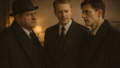 In the background, Inspector Maigret — a large heavyset middle-aged French man with short grey hair, no mustache, heavy-set facial features with deep-set brown eyes and a serious expression, wearing a dark overcoat, exactly matching the Maigret icon — sits alone on a bench in the corner, observing the room calmly with a glass of beer on the marble table in front of him.