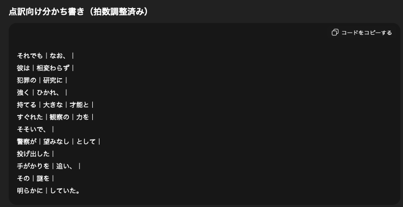 - 拍数リズム(4〜5拍)を優先し、意味が崩れない範囲で翻訳を柔軟に調整する。