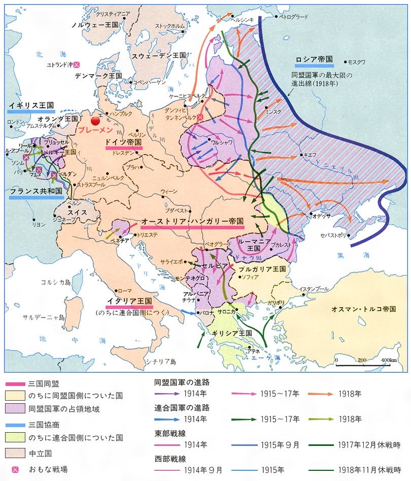 ドイツ軍の主力はベルギー・フランス方面で戦い、国内西部の都市は戦場から遠かった。 - 東部ではロシア軍が東プロイセンで止まり、ブレーメンまで到達しなかった。