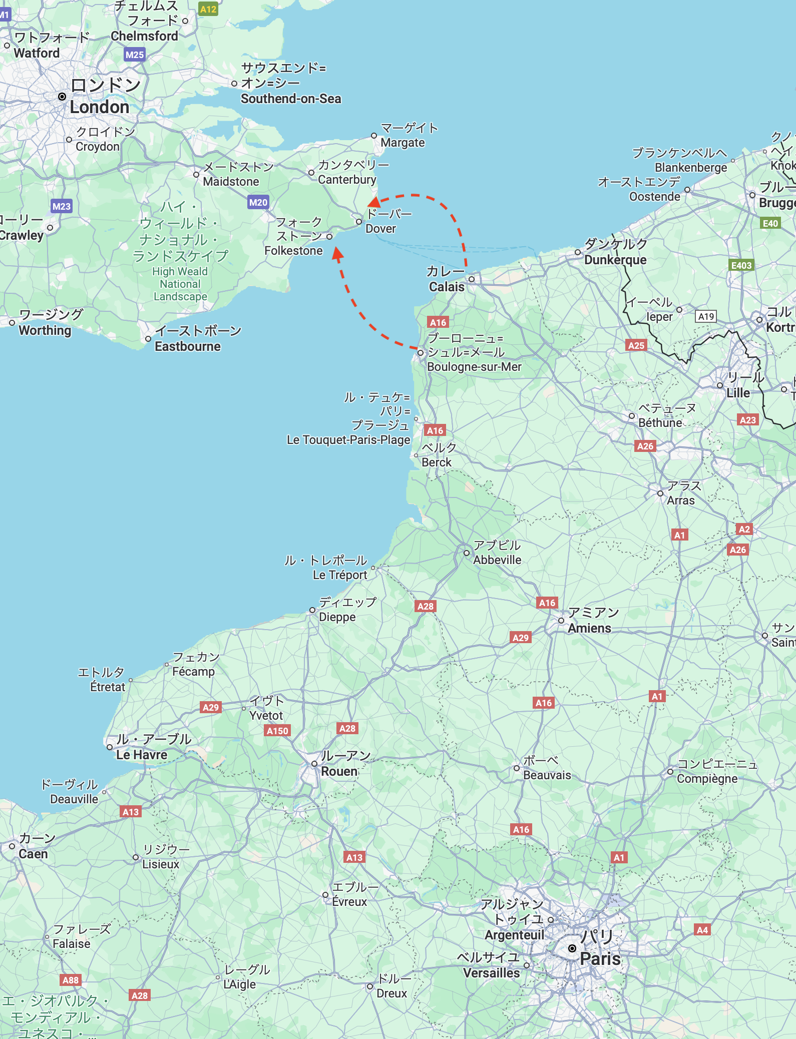 「イギリスとフランスを結ぶ船」というと、いちばん有名なのは カレー(Calais)—ドーヴァー(Dover)間 の航路である。