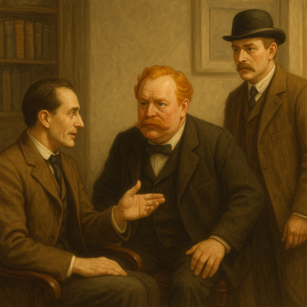 I HAD called upon my friend, Mr. Sherlock Holmes, one day in the autumn of last year, and found him in deep conversation with a very stout, florid-faced, elderly gentleman, with fiery red hair. With an apology for my intrusion, I was about to withdraw, when Holmes pulled me abruptly into the room and closed the door behind me.