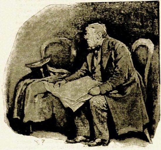 A frayed top-hat and a faded brown overcoat with a wrinkled velvet collar lay upon a chair beside him.