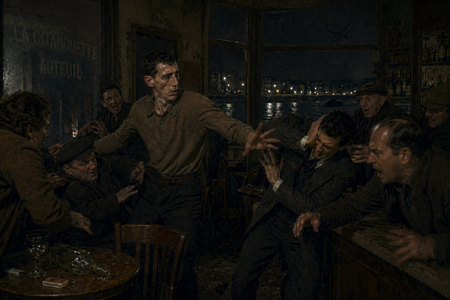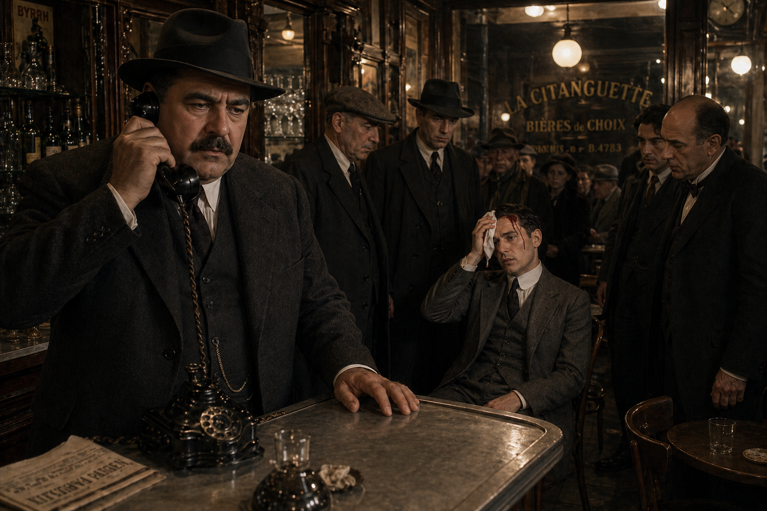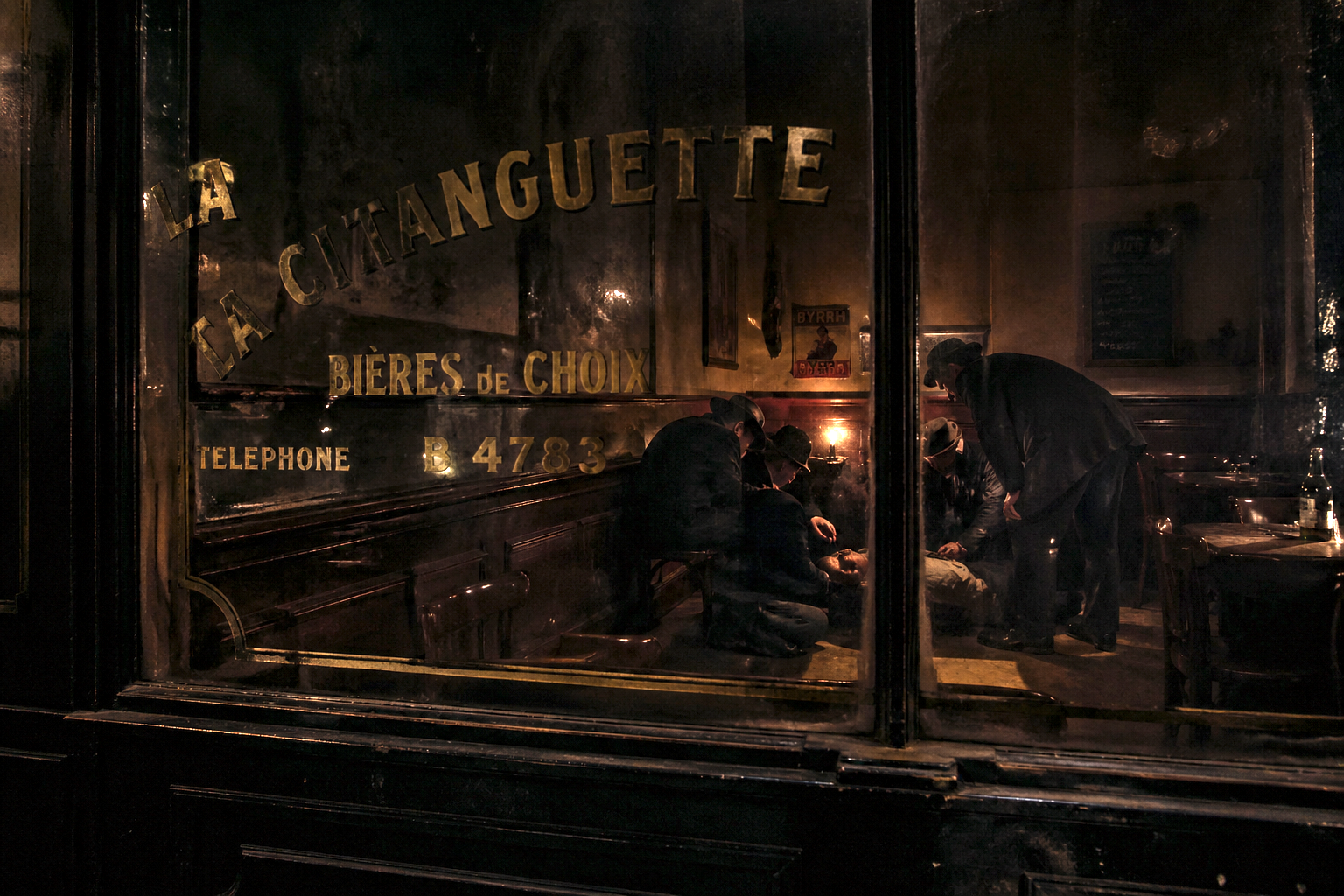 ビストロの中で|動きが|あり、|呼び出し音が|鳴っているのが|わかった。||主人が|電話に|向かおうとした。||リュカが|先に|出た。