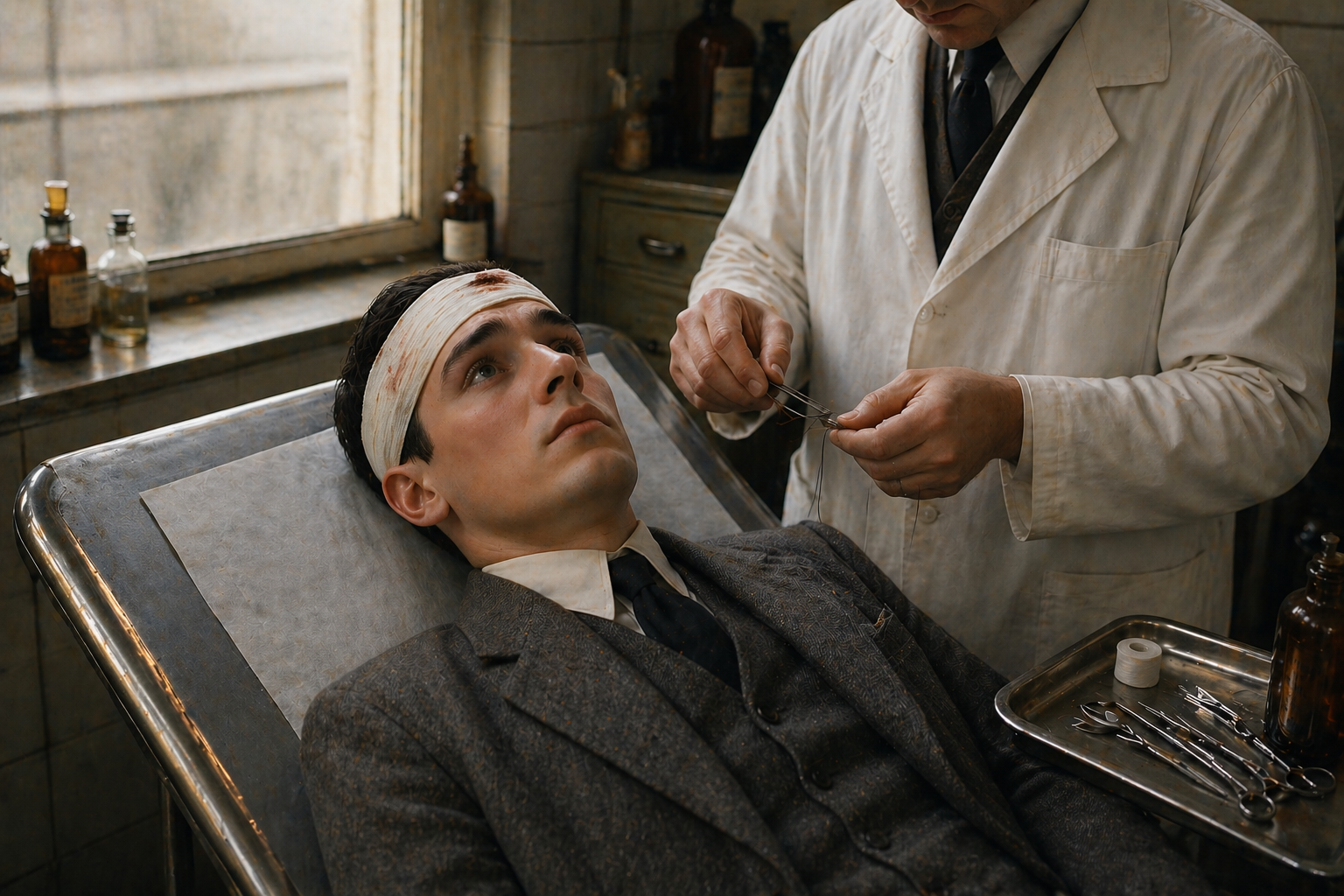 デュフォール刑事は|グルネルの|医者の|鉄製の|診察台に|横たえられ、|医者は|白衣を|羽織りながら|器具の|滅菌を|見守っていた。