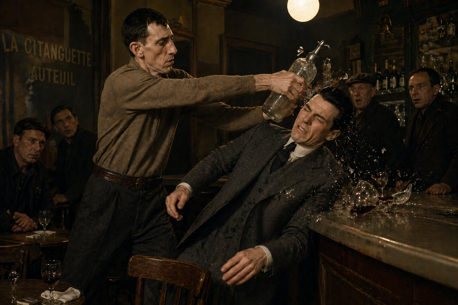突然、|もう一方の手が|隣の|テーブルの上の|サイフォンを|つかみ、|分厚い|ガラスの|瓶が|刑事の|頭に|振り下ろされた。