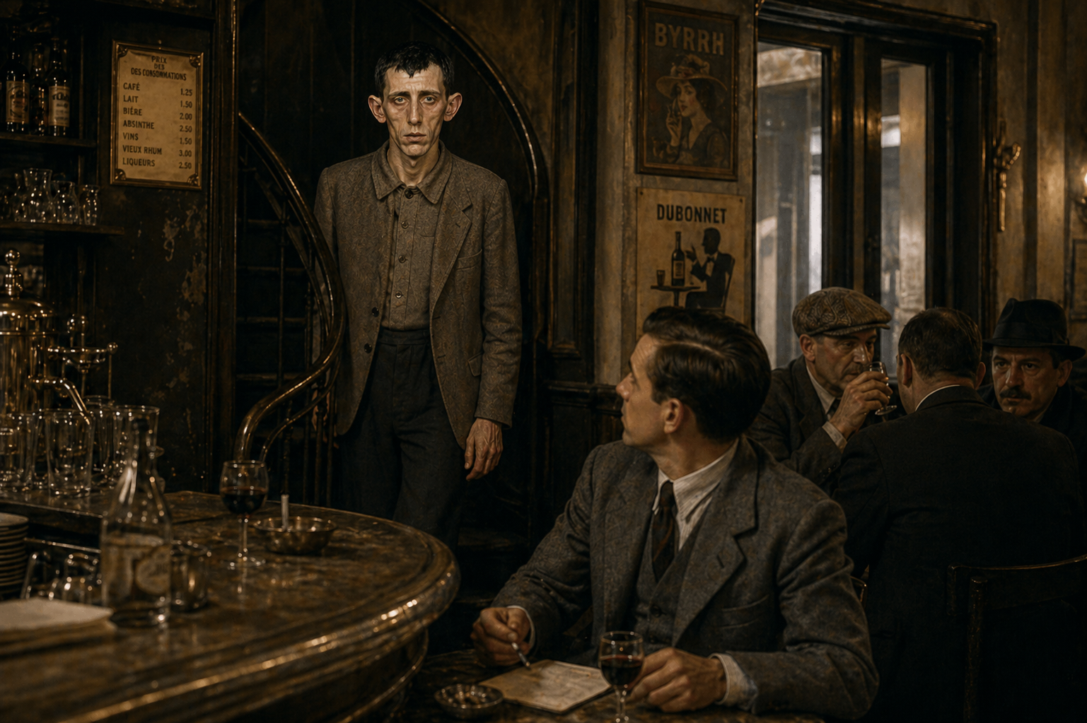 錫の|カウンターの前に|六人ほどの|客がいて、|何人かが|デュフォールを|胡散臭そうに|見ていた。