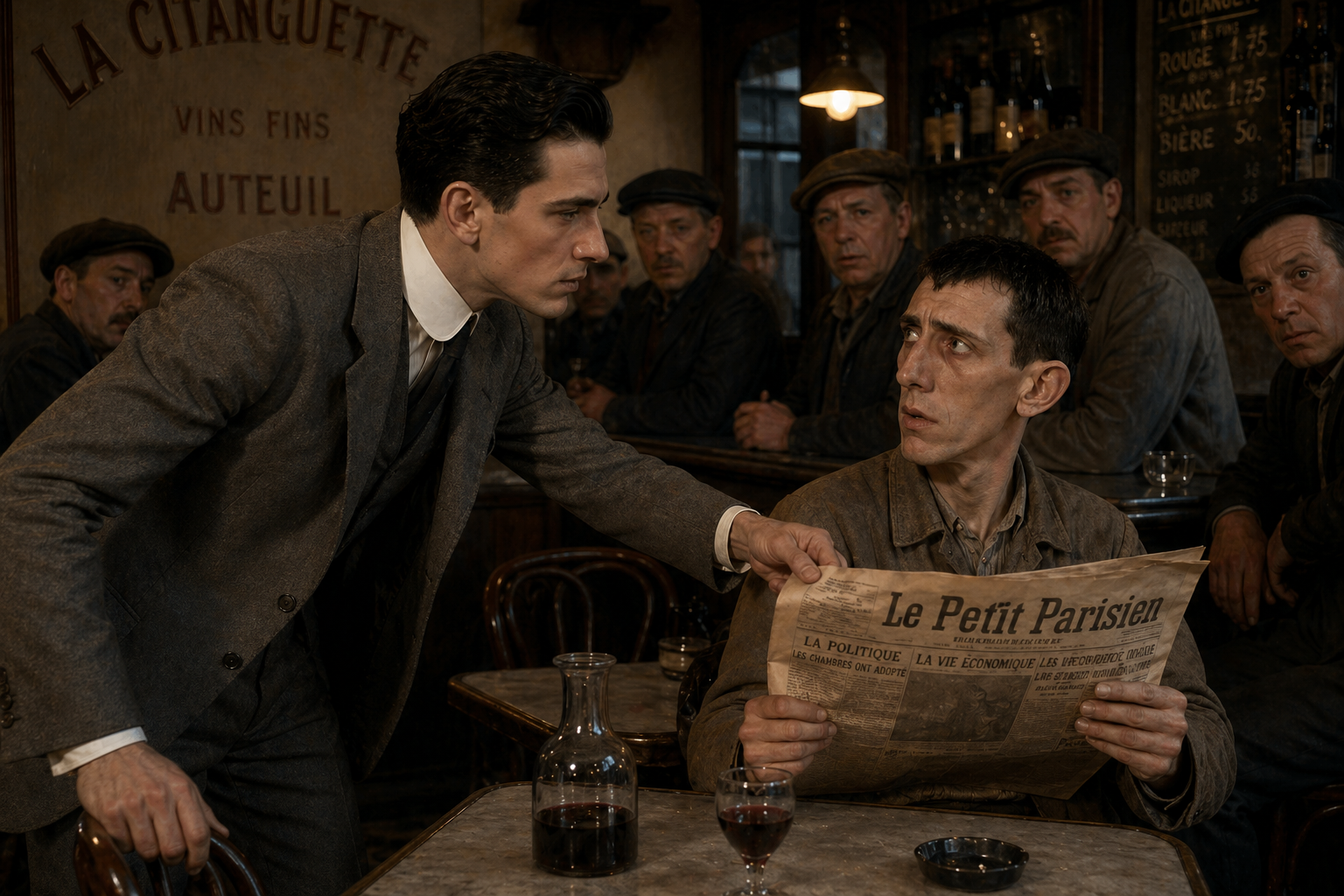 物語の文脈では、|謎の|人物が|このカフェで|シフレ紙への|告発状を|書いたことが|判明した|場面です。一日千人以上が|訪れる|大カフェなので、|誰が|書いたか|特定するのが|非常に|難しいという|状況を|示しています。