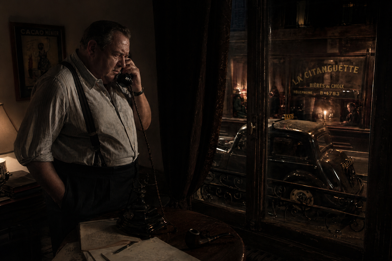 窓から|離れずに、|メグレは|くぐもった声で|電話した。