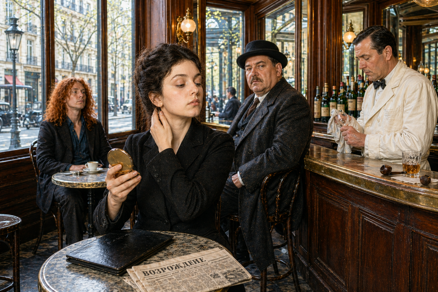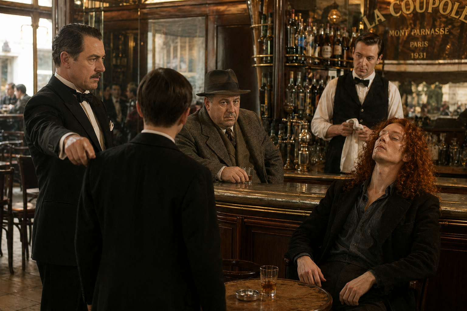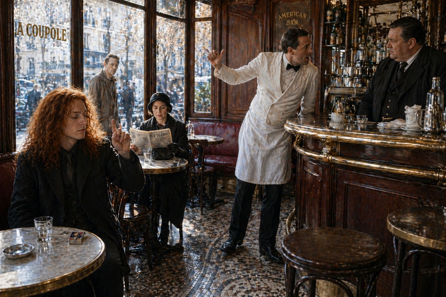 「また|てんかんの|発作を|起こしそうな|男ですね。||カフェの|テラスを|選ぶ|癖が|あるんですよ。||ボーイに|追い払わせます」