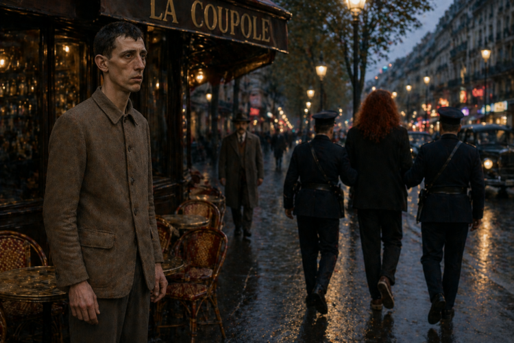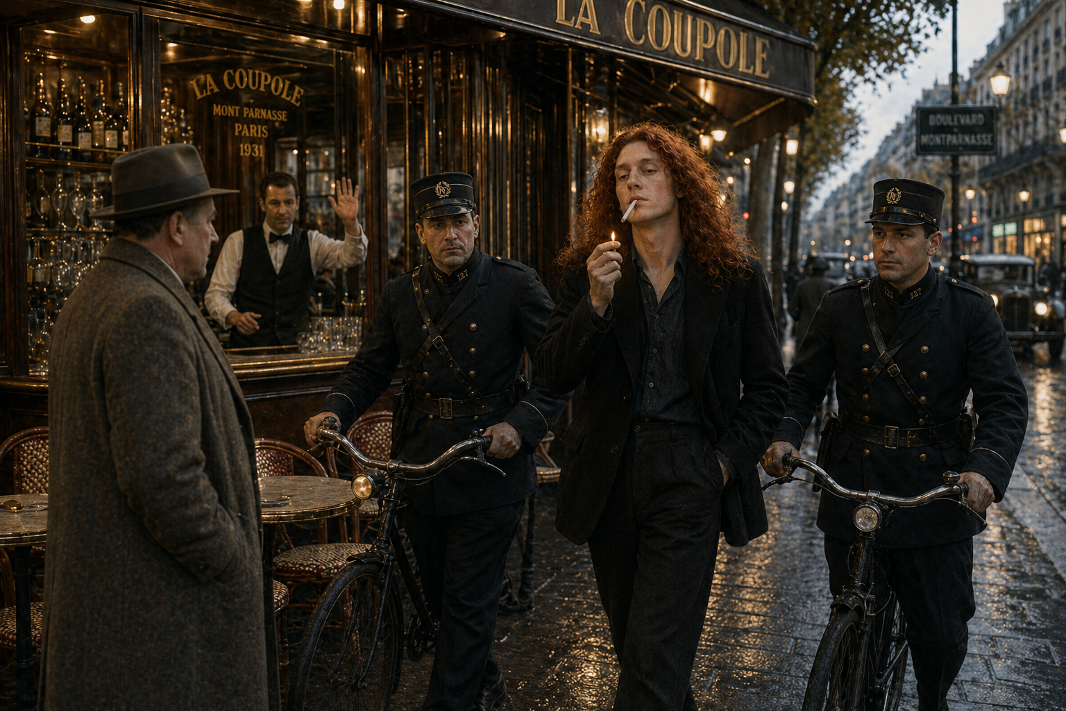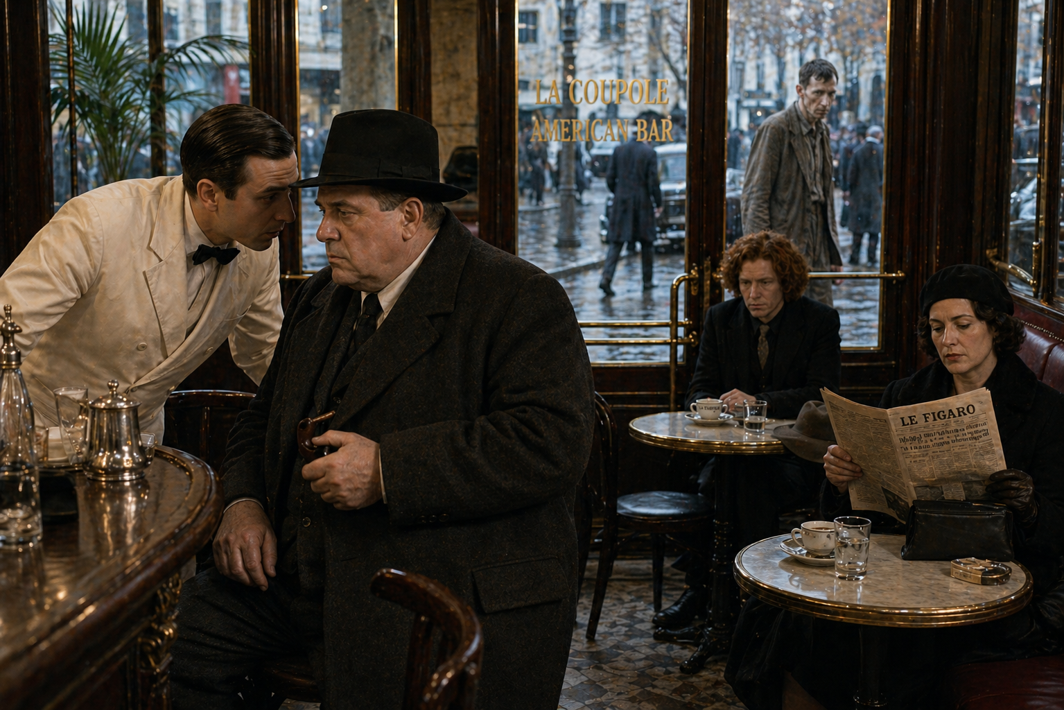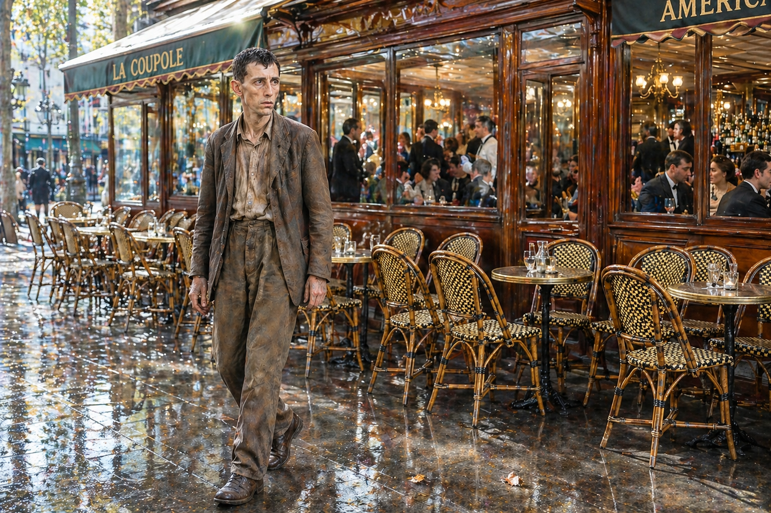 「また|てんかんの|発作を|起こしそうな|男ですね。||カフェの|テラスを|選ぶ|癖が|あるんですよ。||ボーイに|追い払わせます」