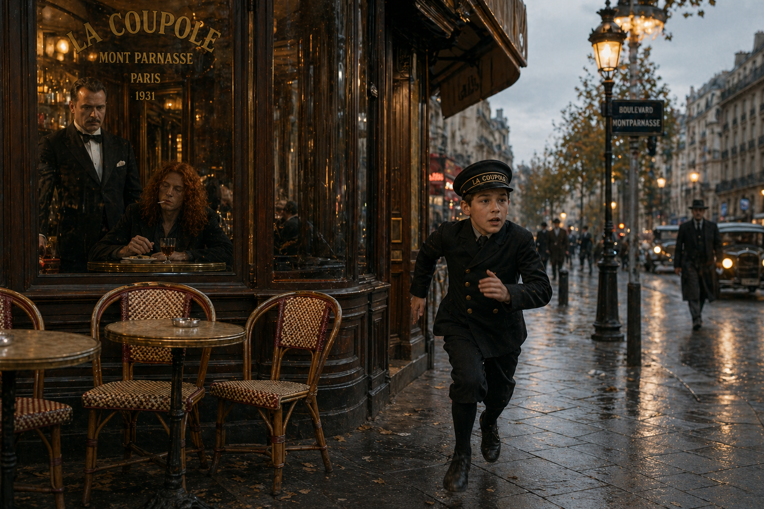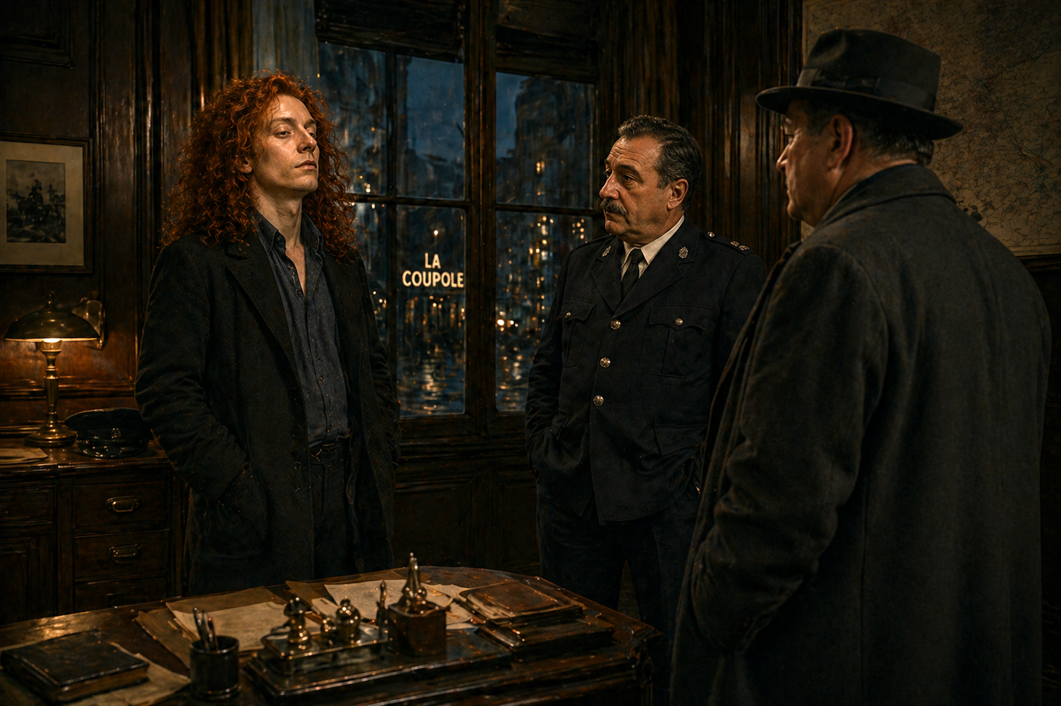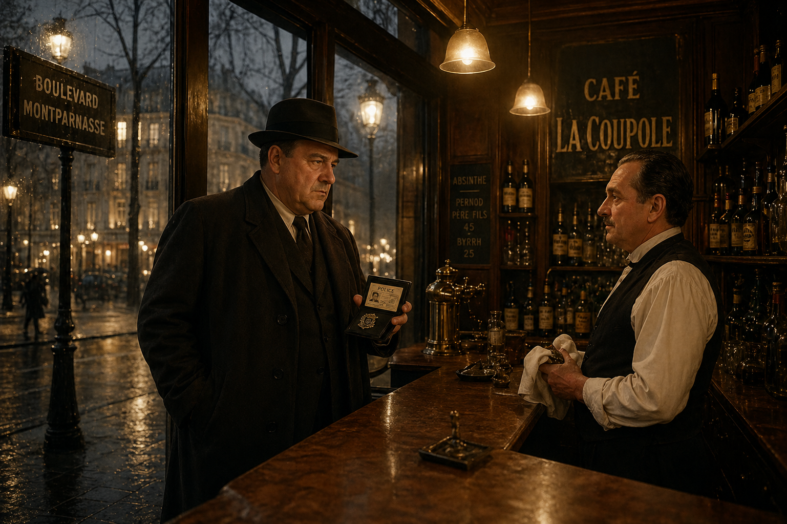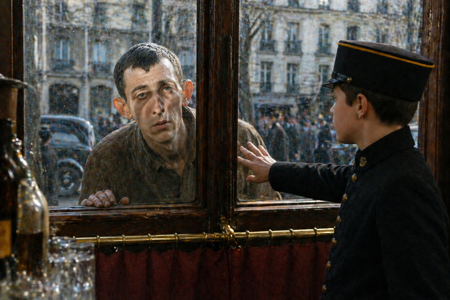 十六歳にも|なっていない|ボーイが|みすぼらしい男に|声を|かけ、|男は|また|足を|引きずりながら|遠ざかった。||リュカ部長刑事が|タクシーから|降りて|入ってきて、|驚いた|様子で、|ほぼ|空の|店内を|さらに|驚いた|顔で|見回した。